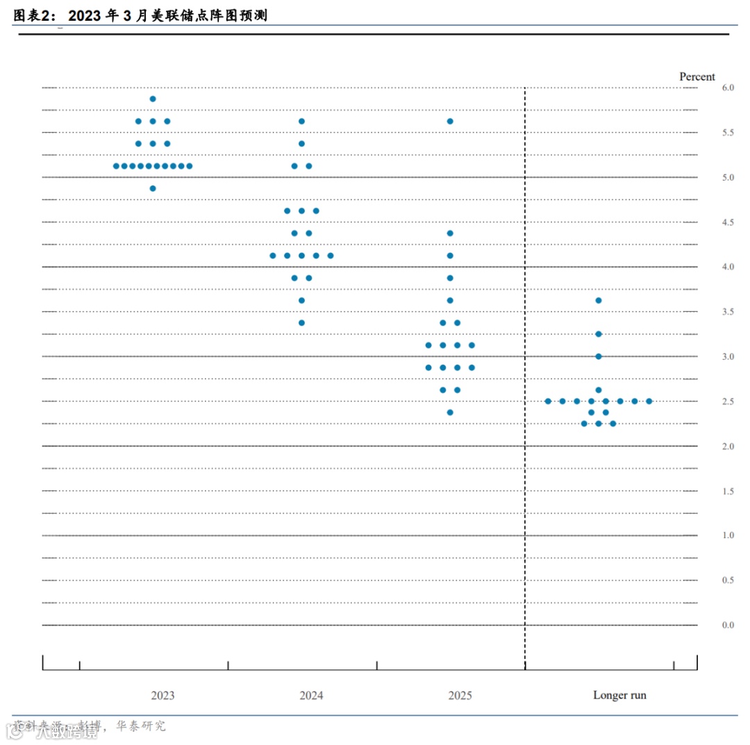 加息路径方面,美联储软化前瞻指引,但鲍威尔强调基准情形下2023年不降息。鲍威尔称,3月会议曾考虑停止加息,但增长和通胀保持强劲,委员会一致支持加息25个基点。美联储软化前瞻指引中的表述,不再预计持续加息(ongoing rate increases),而是强调额外紧缩(some additional policy firming)可能是适当的,为停止加息保留了灵活性,更加接近停止加息。但鲍威尔强调,降息不是2023年的基准情形(rate cuts are not in our base case),具体路径将取决于数据,这与市场的降息预期存在巨大分歧。3月点阵图显示美联储指示美联储2023年不准备降息,18位委员中17名联储官员预计2023年利率超过5%,10位委员预计2023年底利率为5.1%,基本持平于去年12月的预测(图表2)。