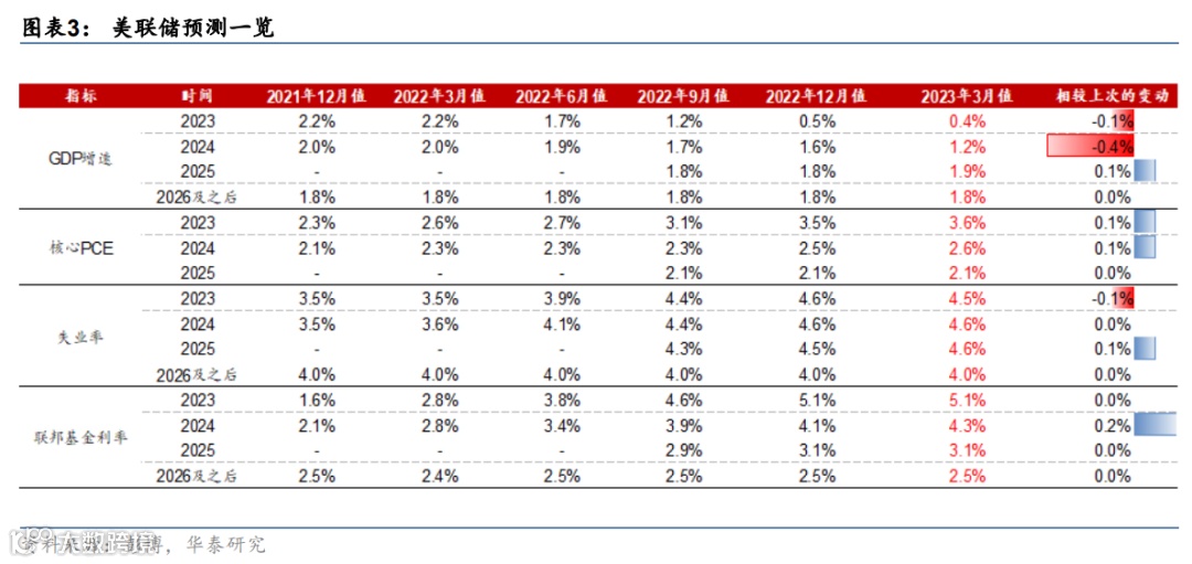 美联储小幅下调近期增长预测,并上调通胀预测。2023-24年四季度GDP增速预测下调至0.4%(-0.1pct)和1.2%(-0.4pct),2025年四季度GDP增速预测上调至1.9%(+0.1pct);2023-24年四季度核心PCE预测均上调0.1个百分点至3.6%和2.6%;2023年四季度失业率预测下调0.1个百分点至4.5%(图表3)。此外,联邦基金利率的中位数预测显示,2023-25年年末的利率分别为5.1%、4.3%和3.1%,2024年上调了0.2个百分点,2023年和2025年保持不变。