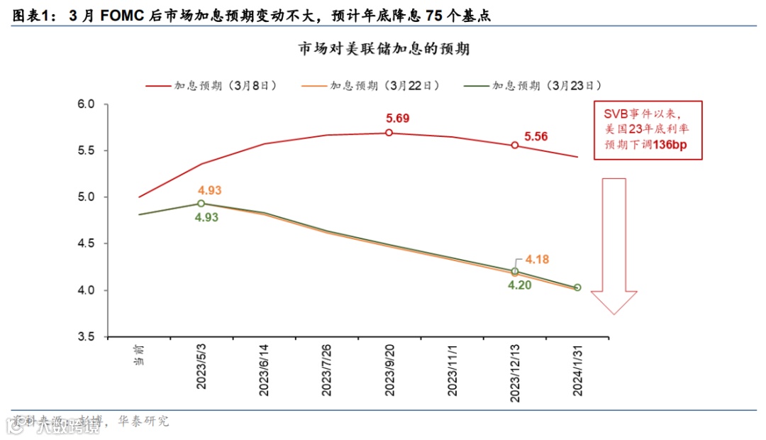 北京时间3月23日(周四)凌晨,联储3月FOMC决议加息25个基点、基准利率升至4.75%-5.0%区间,释放一定鸽派信号,决议声明软化了加息的前瞻指引,承认曾考虑过3月不加息,但点阵图指示未来还有一次加息,2023年不降息。缩表方面,美联储仍然维持月度950亿美元(600亿国债+350亿MBS)的缩表速度。议息决议公布后,标普500及纳斯达克综指分别下跌1.7%和1.6%,2年期和10年期美债收益率分别下降23bp和17bp至3.93%和3.43%,美元指数下跌0.7%至102.5。会后市场的加息预期变动不大,预计5月有48%的概率加息25bp,加息终点达到4.93%,下半年降息75bp(图表1)。