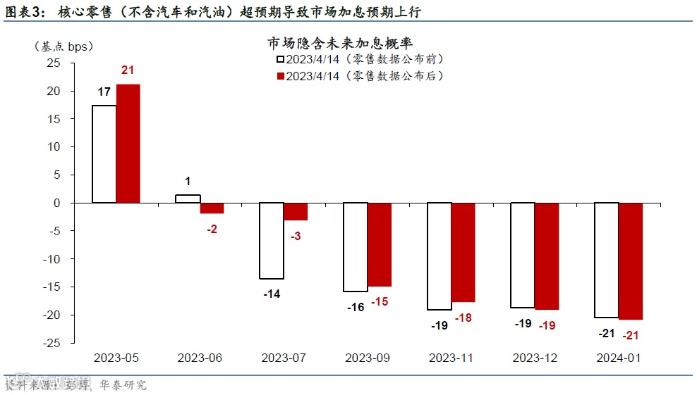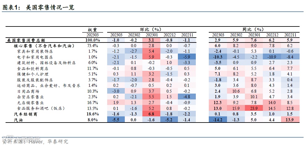 3月零售消费环比连续第二个月为负,录得-1.0%,大幅低于彭博一致预期的-0.5%,同比增速下降3.0pct至2.9%;剔除汽车和汽油的核心零售环比为-0.3%,高于彭博一致预期的-0.6%,同比为6.0%,低于前值的8.2%。从分项来看,汽油、汽车、耐用品消费均明显下滑,部分服务相关消费增速也出现放缓(图表1和2)。虽然零售不及预期,但是核心零售销售好于预期,美元指数小幅上涨0.2%至101.2、美国2年期和10年期分别上行12bp和5bp至4.08%和3.49%,市场预期3月FOMC加息25bp的概率从69%上升至85%(图表3)。