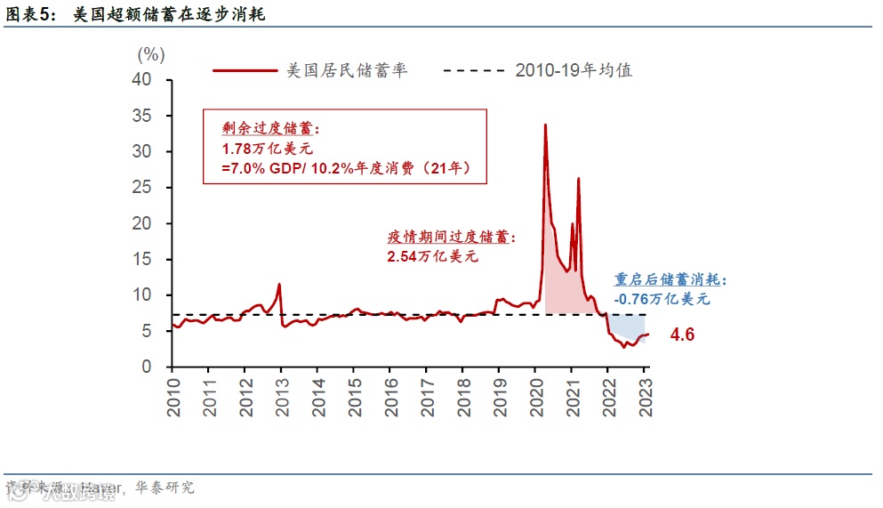 3月零售增速明显放缓,显示美国消费出现边际走弱迹象。3月零售销售走弱部分可能是因为硅谷银行风波的冲击。BEA高频的刷卡数据可以看到,硅谷银行暴雷后消费一度在3月最后一周明显走弱,但4月第一周又出现边际反弹,背后可能是因为4月7日感恩节前消费,是否能持续存在不确定性(图表4)。从就业、工资和信心来看,美国消费引擎有“熄火”的可能性,具体时点仍需要观察:3月新增非农就业整体放缓,尤其是吸纳更多就业的服务业就业;小时工资的季环比折年增速也进一步放缓;美国密歇根消费者信心指数也结束了连续四个月的上行,显示消费信心开始回落。此外,超额储蓄和财富效应也指示消费未来面临压力:疫情期间居民的超额储蓄在逐渐消耗(图表5),而2022年股市和地产价格下跌导致居民财富同比增速转负,也可能会抑制消费。