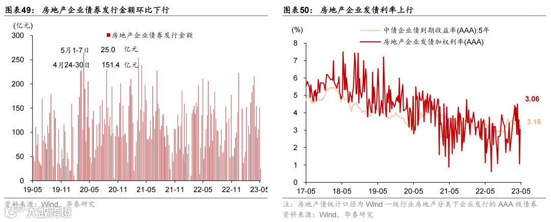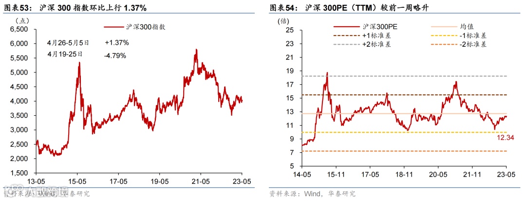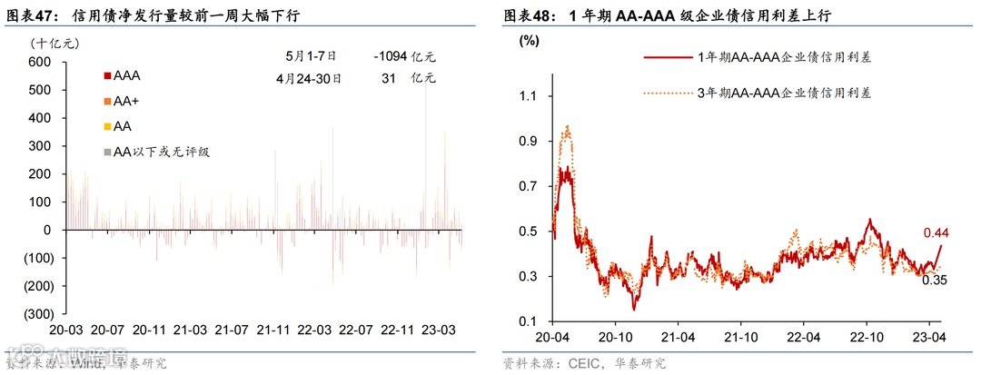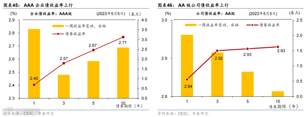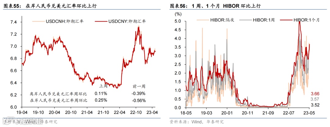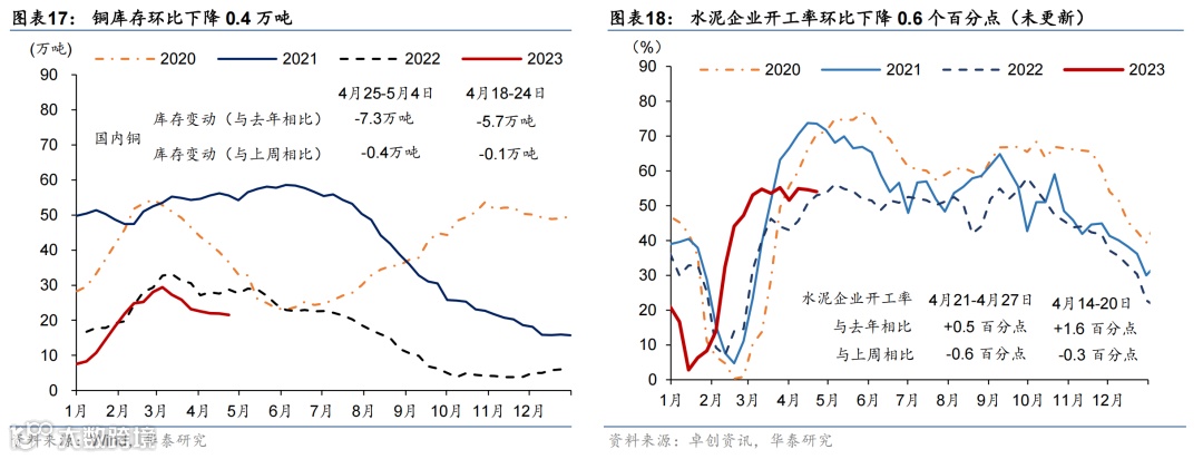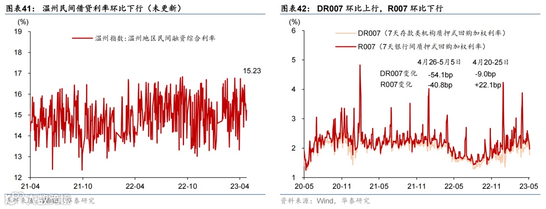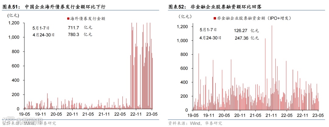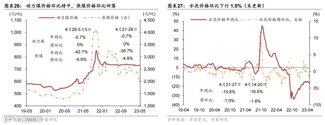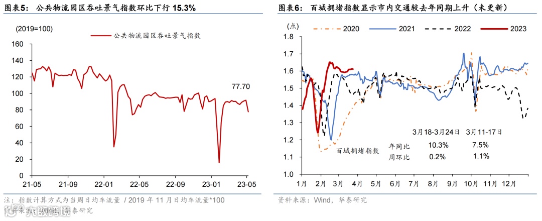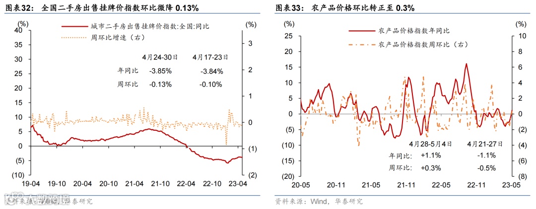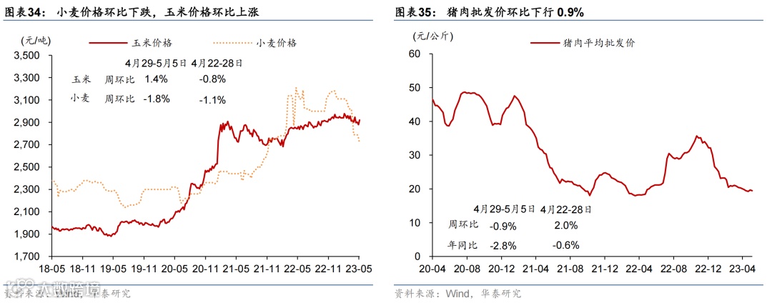国际油价走低,国内原材料价格持续回落,农产品价格环比微涨。或受美国债务上限及银行风险影响,上周布伦特油价环比下跌5.3%至75.3美元/桶。上周国内螺纹钢、铜和焦煤价格环比回落3.7%/2.3%/6.6%;中游化工品价格整体走低,尿素/氯化钾/聚乙烯价格环比下行0.4%/1.6%/3.8%,但丁苯橡胶价格环比上行1.7%。运价仍在低位,上周出口集装箱运价指数环比上行3.6%,波罗的海运价指数环比下降1.5%。农产品价格指数环比转正至0.3%,其中玉米价格环比上行1.4%,但小麦/猪肉价格分别环比下行1.8%/2.0%。