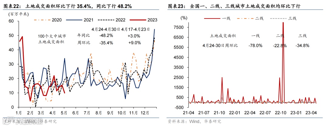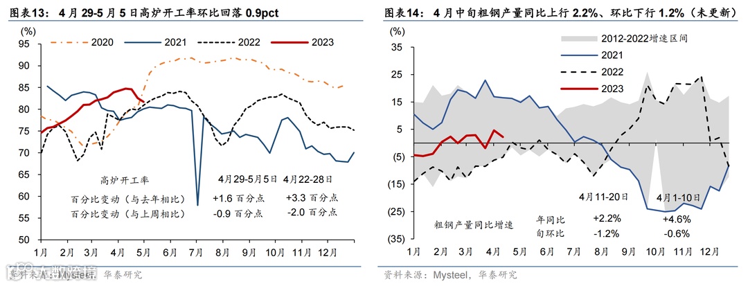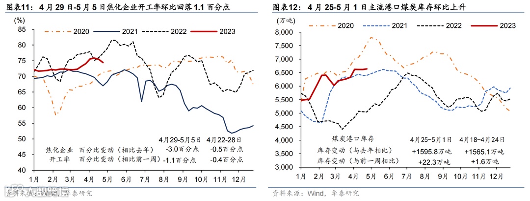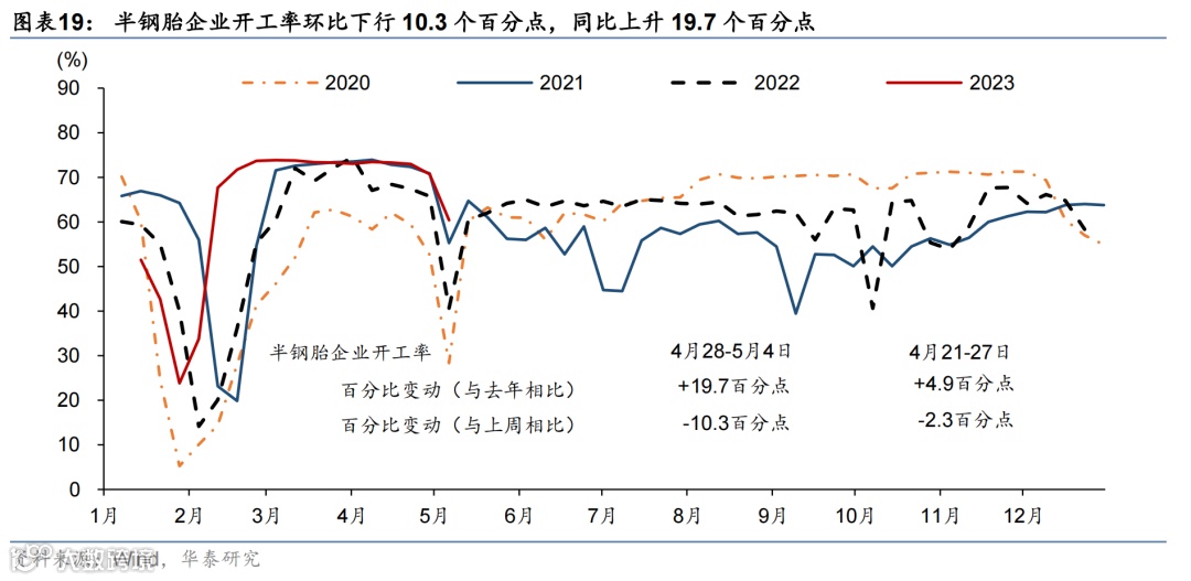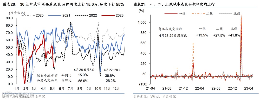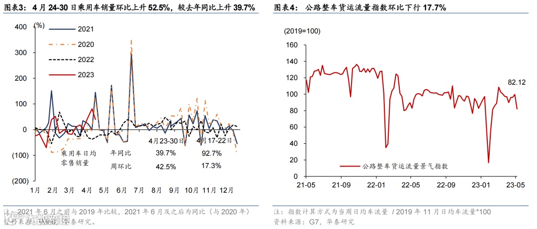 五一假期居民出行延续高景气度,工业生产较去年五一表现偏强,但新房和二手房成交面积较往年仍偏弱,且土地成交同比下行。节日期间居民交通出行延续高景气度:18 城地铁客运量数据较2021/2019年同期上行9%/15%,国内/国际航班数恢复至2019年均值的116%/50%。五一假期公共交通日均发送旅客数较2022年同期增长163%、恢复至2019年同期的80.7%,而全国高速公路流量同比增长102%,较2019年亦有约2成的增幅。物流景气度指标同比下行:全国整车货运流量和公共物流园区吞吐景气指数同比下行2.0%/6.4%,分别为2019年均值水平的82.1%和77.7%。消费方面,“五一档”电影总票房回升至2019年的99.4%;5月第一周汽车零售同比上行39.7%。工业生产较去年表现较强:高炉/半钢胎企业开工率同比回升+1.6/+19.7个百分点。地产方面,新房和二手房较2021年同期仍偏弱,且土地成交同比走弱:上周 30 城商品房成交面积较2021年下行49%;26城二手房成交面积较2021年同期下行31.8%。4月24-30日,百城土地成交面积同比仅为去年5成左右(前一周同比上行3.5%)。