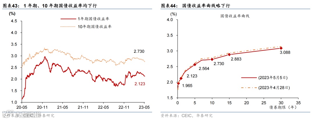 资金面有所宽松,人民币兑美元汇率环比小幅上行。银行间利率整体下行,R007下行40.8个基点,DR007下行54.1个基点,企业债收益率上行。国债收益率曲线小幅下移,1/10年期国债收益率分别下行2/5个基点。融资方面,上周信用债、海外债、地产债和股权融资额均较前一周走低。汇率方面,人民币兑美元汇率环比上行0.2%,而较一篮子货币回落0.2%。