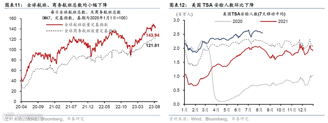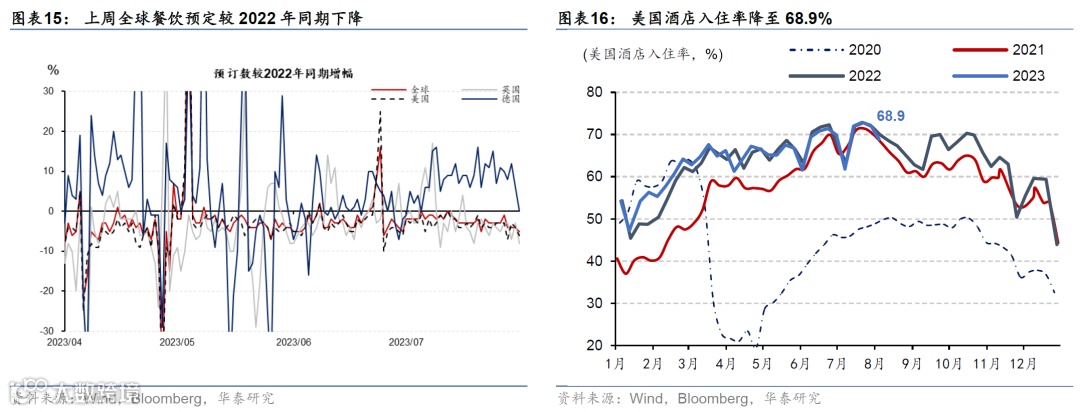 高频数据显示,全球出行持续降温。全球航班数量较前一周环比下降1.0%,商务航班环比下降0.4%;美国TSA安检人数环比下降1.7%,纽约地铁客运量环比下降2.1%。美国酒店入住率较前一周下降3.3pct至68.9%。