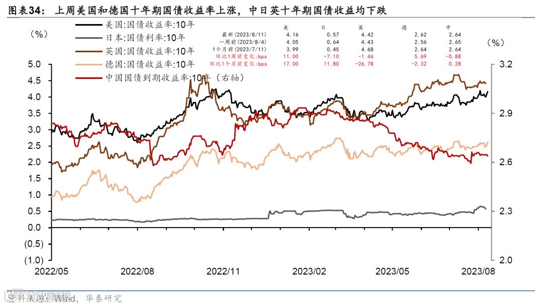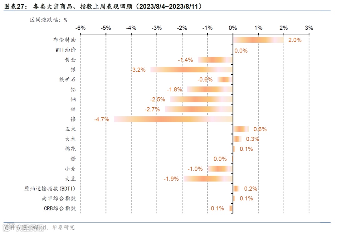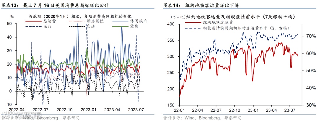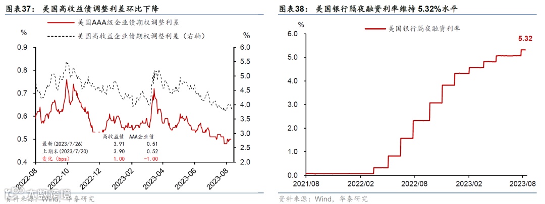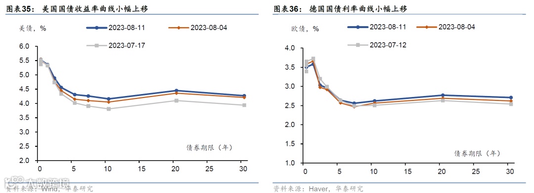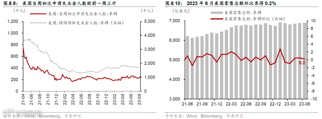 美国CPI数据整体偏弱,符合预期;PPI环比超预期指示通胀存在潜在压力;首次申领失业金人数高于预期,劳工市场边际减速。7月美国CPI和核心CPI环比均为0.2%,与彭博一致预期和前值一致;CPI同比上升0.2pct至3.2%,略低于彭博预期的3.3%;核心CPI同比下降0.1pct至4.7%。从分项来看,能源价格环比下降至0.1%,食品分项小幅回升至0.2%;二手车及部分耐用品价格回落,导致核心商品通胀环比增速下降0.2pct至-0.3%;粘性较强的核心服务分项环比回升0.1pct至0.4%,其中,住房分项持平前值,而住房外其他核心服务小幅上行0.1pct至0.2%。美国7月PPI和核心PPI环比为0.3%,均高于彭博一致预期的0.2%,指示通胀面临一定潜在压力。美国当周首申人数为24.8万人,高于彭博一致预期的23万人,显示劳工供给瓶颈或有所缓解。