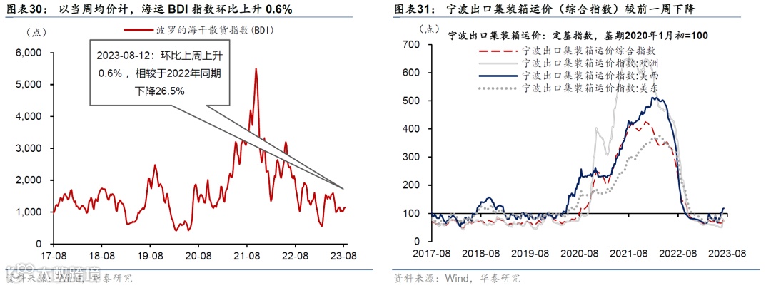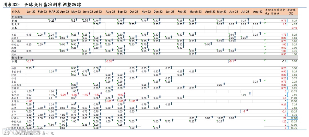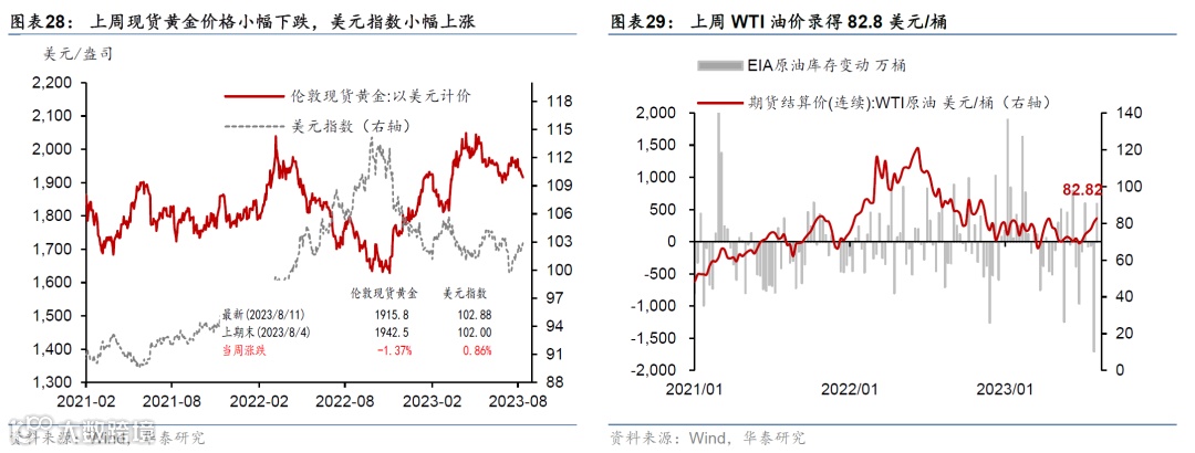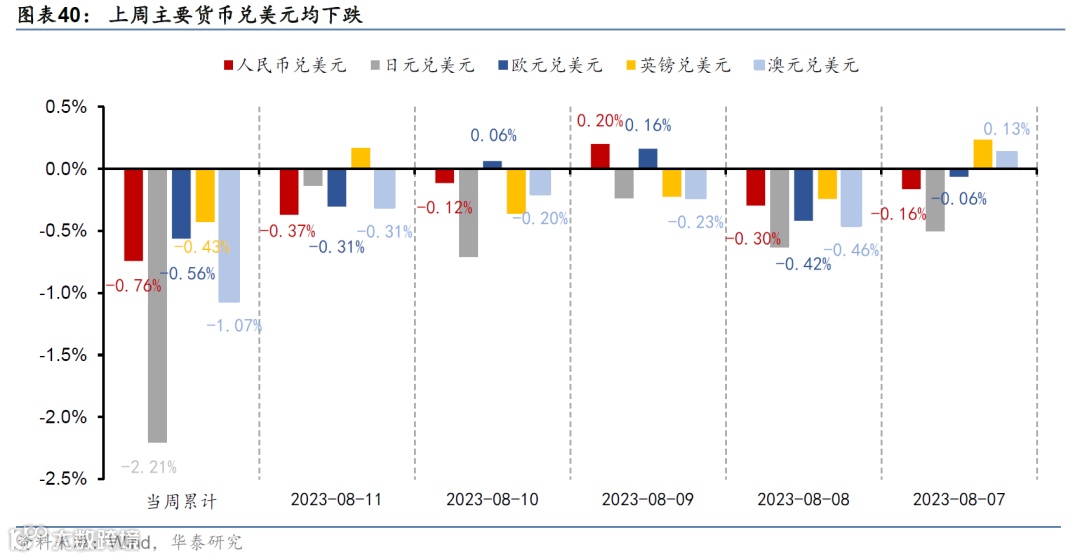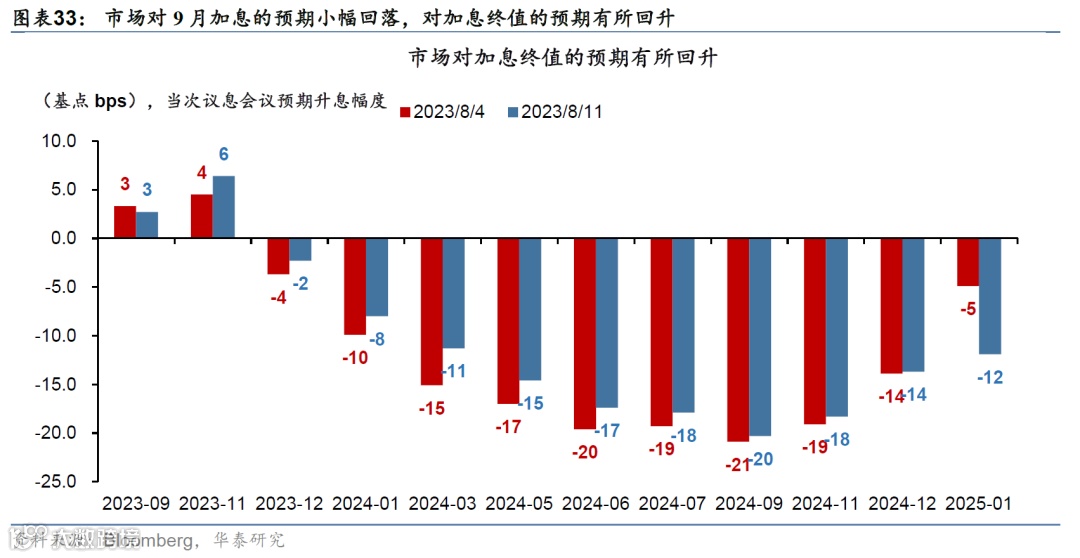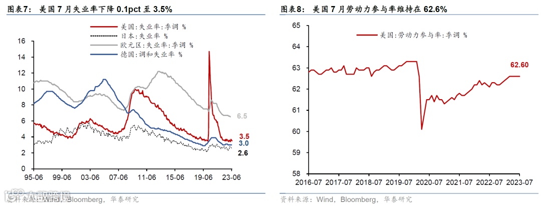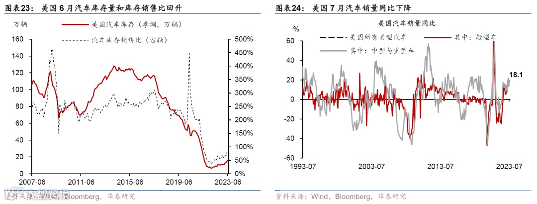 美国CPI数据整体偏弱,符合预期;PPI环比超预期指示通胀存在潜在压力;首次申领失业金人数高于预期,劳工市场边际减速。7月美国CPI和核心CPI环比均为0.2%,与彭博一致预期和前值一致;CPI同比上升0.2pct至3.2%,略低于彭博预期的3.3%;核心CPI同比下降0.1pct至4.7%。从分项来看,能源价格环比下降至0.1%,食品分项小幅回升至0.2%;二手车及部分耐用品价格回落,导致核心商品通胀环比增速下降0.2pct至-0.3%;粘性较强的核心服务分项环比回升0.1pct至0.4%,其中,住房分项持平前值,而住房外其他核心服务小幅上行0.1pct至0.2%。美国7月PPI和核心PPI环比为0.3%,均高于彭博一致预期的0.2%,指示通胀面临一定潜在压力。美国当周首申人数为24.8万人,高于彭博一致预期的23万人,显示劳工供给瓶颈或有所缓解。