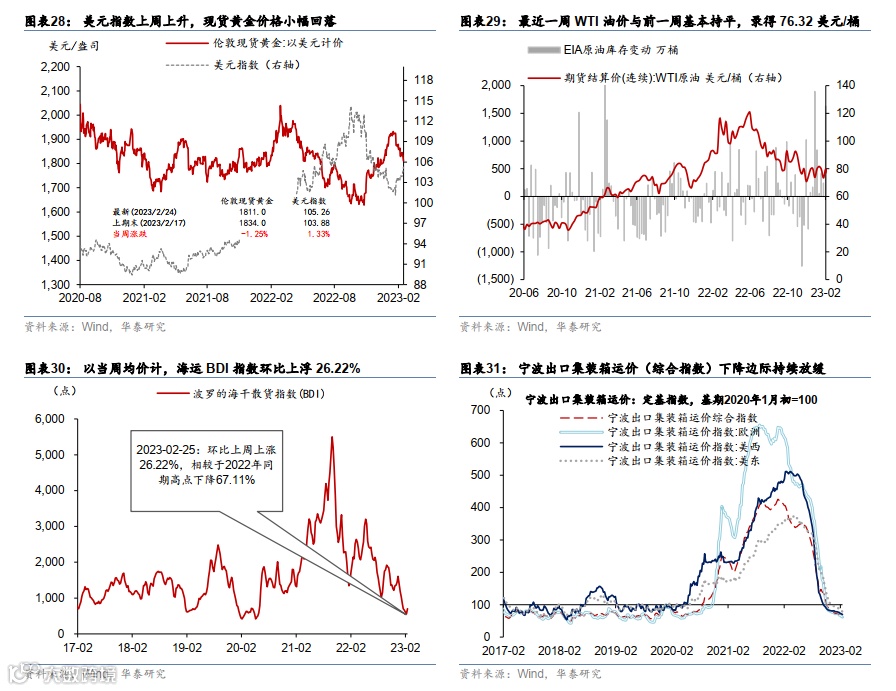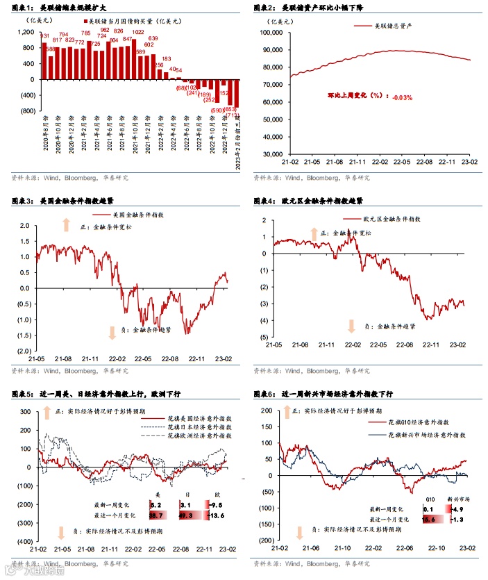 美国与欧元区2月PMI大幅上行,服务业持续回暖;美国1月PCE数据亦超预期。美联储与欧央行重申抗通胀决心,市场加息预期走高。日本通胀数据创新高,日央行坚持宽松货币政策。受鹰派加息预期影响,美元指数持续上升,美债利率上行,大宗商品价格和全球股市普遍回落。