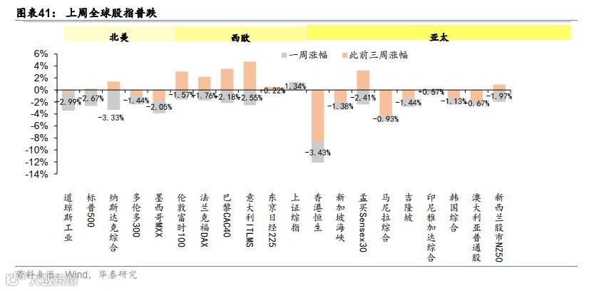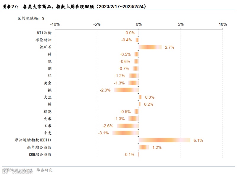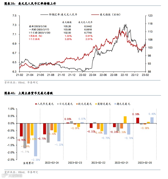 加息预期强化,美元指数持续上升,美债长短端利率上行,大宗及股市普跌。期货市场隐含的联邦基金利率终值上升至5.4%。美国FOMC纪要和PMI数据发布后,美元指数延续涨势,最终收于105.3;美债长短端利率均上行,10年期、2年期国债收益率分别上行13bp、16bp,收于3.95%、4.78%。大宗商品方面,天然气需求回暖,原油价格与前一周基本持平,金属价格与农产品价格多数下跌。股市方面,上周全球股指普跌,标普500和纳斯达克指数分别下跌2.7%和3.3%,抹去前三周涨幅。