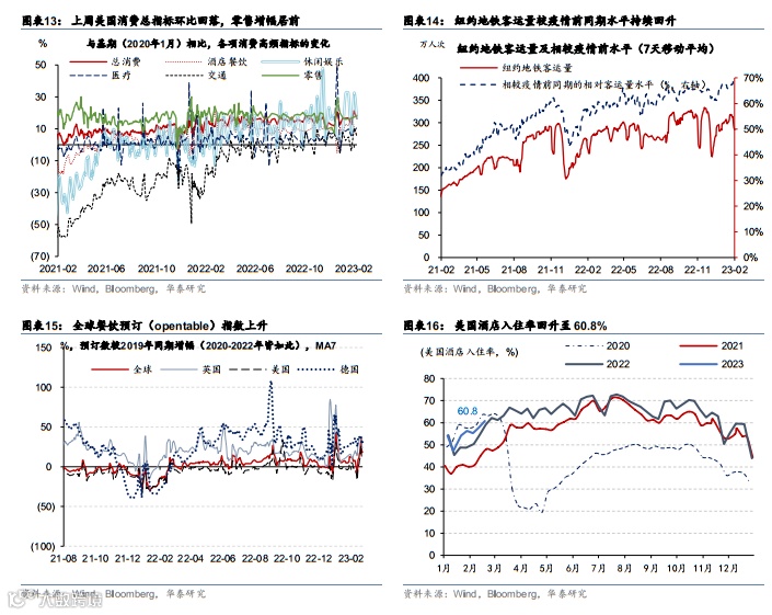 高频数据显示,美国出行持续升温,消费有所回落。上周美国TSA安检人数环比上行,纽约地铁客运量与疫情前同期相对客运水平相比已持续回升近三周。酒店入住率回升至60.8%,主要受温暖天气下海滨城市旅游升温的推动。美国消费方面,总消费环比回落24%,各分项多数下行,仅零售和医疗小幅上涨。
