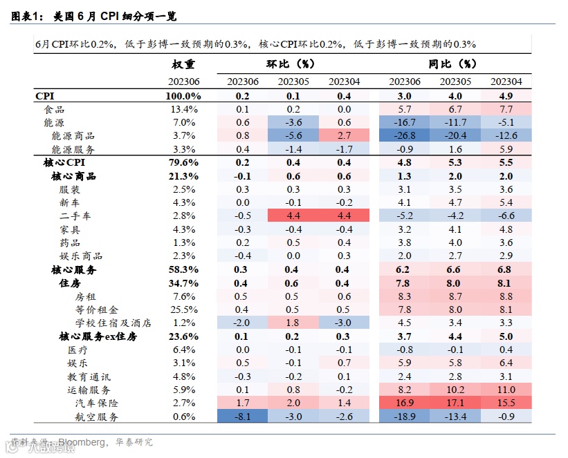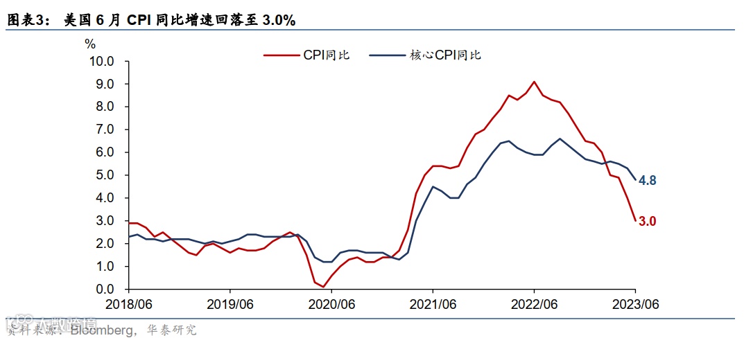 美国6月CPI全面低于预期,为2021年4月以来首次回落至3%以内,与我们的预期一致——6月CPI同比回落1pct至3.0%,低于彭博一致预期的3.1%;核心CPI同比回落0.5pct至4.8%,低于彭博一致预期的5.0%;CPI环比从5月的0.1%回升至0.2%,低于彭博一致预期的0.3%,核心CPI下行0.2pct至0.2%,同样低于预期(0.3%)。与我们的预期一致,二手车、住房以及疫后季节性回落的出行分项导致核心通胀回落超预期(参见《美国通胀或将超预期下行》,2023/7/11)。低于预期的CPI数据公布后,美元指数走弱,美债长短端收益率明显下行,降息预期回落——截至北京时间晚上21:00,美元指数下跌0.9%至101.2,2年期和10年期美债收益率较前一天的收盘价分别下行10bp和6bp至4.77%和3.91%,联邦利率期货显示美联储7月加息25bp概率持平于87%,加息终点从5.43%下降至5.39%。