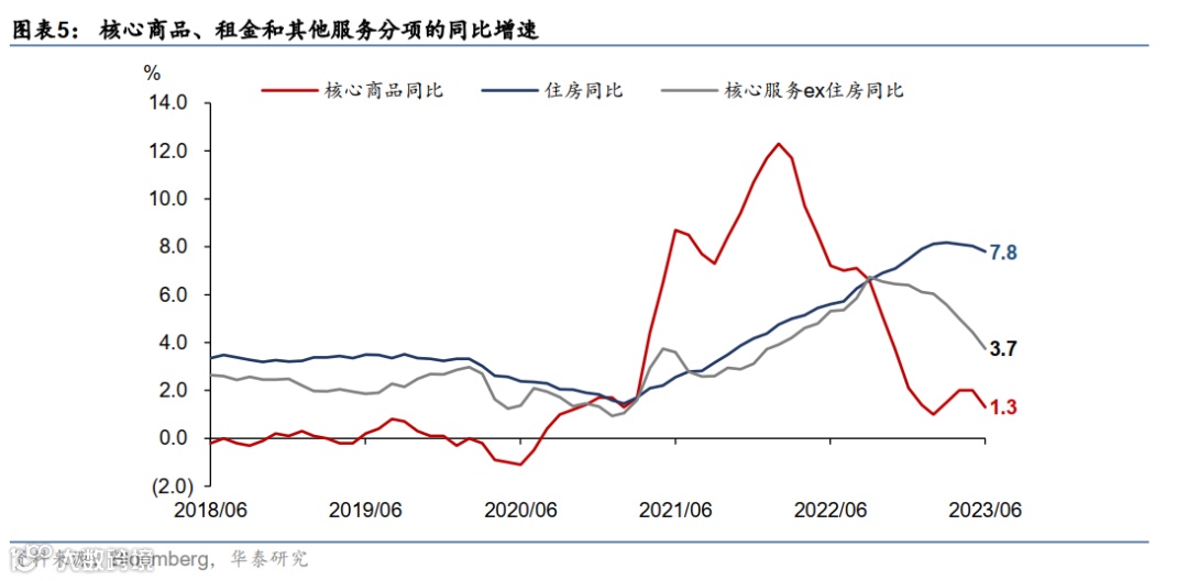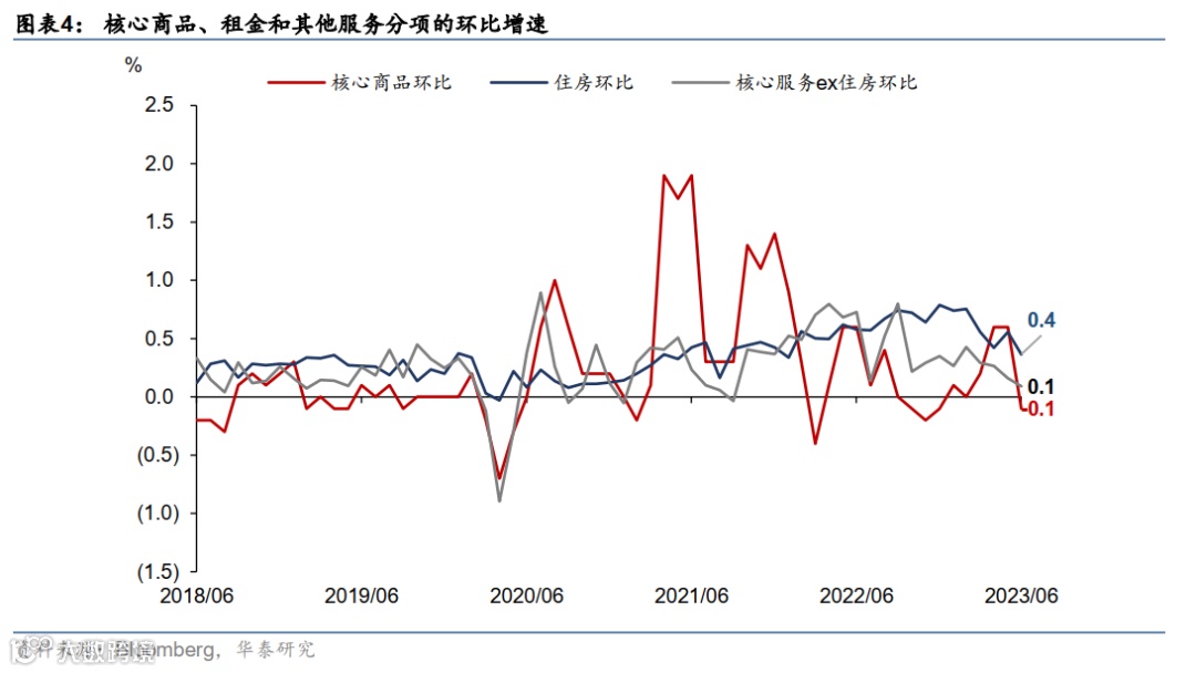 黏性较强的核心服务通胀环比回落0.1pct至0.3%,主要分项均回落。其中,住房分项环比下降0.2pct至0.4%,主要系学校宿舍及酒店分项拖累;黏性较强的房租(0.5%)和等价租金(0.4%)保持回落或持平。美联储比较关注的核心服务ex住房通胀环比同样出现回落,从5月的0.2%回落至0.1%。其中出行服务下降0.7pct至0.1%,机票价格环比下降8.1%。出行服务超预期回落主要系疫情后季节调整倾向于将二手车、酒店以及机票价格等分项环比增速调整到较疫情前更低的水平,从而压低相关分项环比增速。