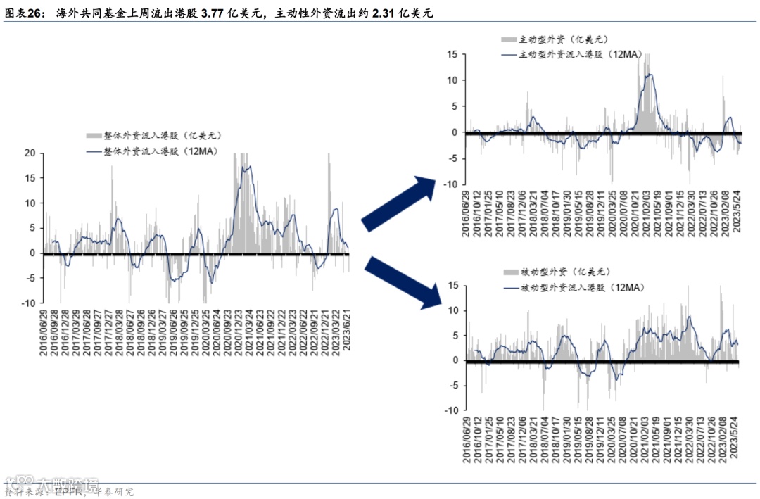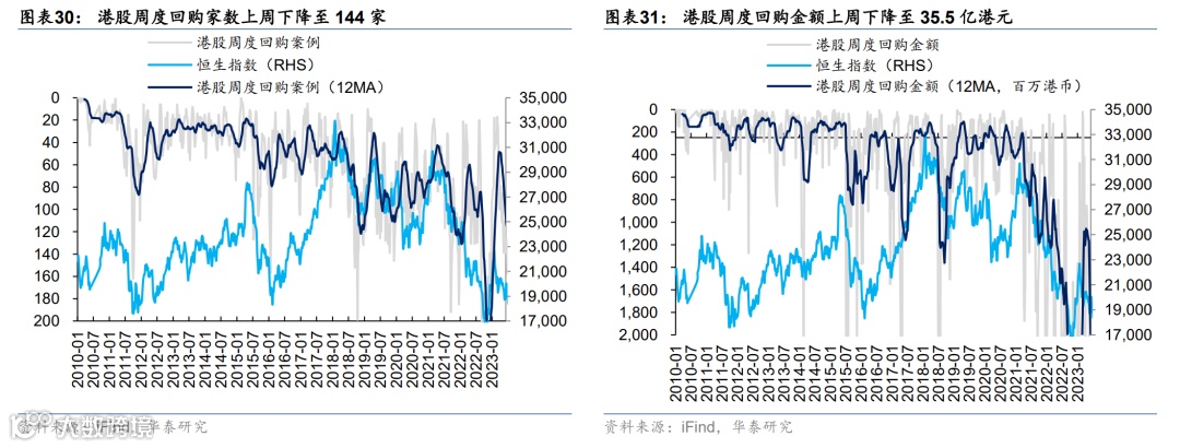 资金流动和头寸:1)南向资金,刻画内资对港股的配置行为和当期行业偏好。2)外资动向,利用EPFR提供的海外共同基金资金流数据,监测外资主动、被动型共同基金的交易行为与偏好。3)空头头寸,利用恒生指数看沽看购头寸比刻画空头头寸,自下而上计算了港股互联网、地产两大重点板块的做空比例情况,反映空头对港股整体和主要港股板块的交易行为与偏好。4)产业资本,统计全部港股产业资本回购的家数和总金额情况,一般而言,产业资本大额回购是重要的底部行为信号。