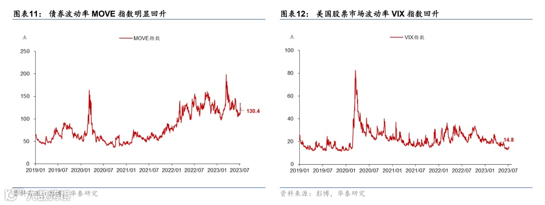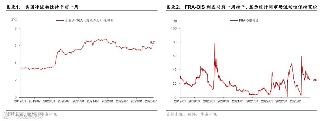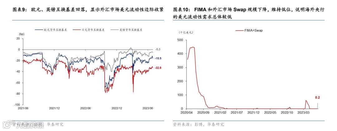 美元流动性指标:1)美元净流动性=美联储总资产-财政存款-逆回购是流入金融体系的资金量,净流动性越高,美元整体越充裕。2)银行系统压力监测指标,FRA-OIS利差是3个月期Libor和隔夜利率互换之间的差额,息差扩大反映了银行间借贷成本上升;美国银行业存款累计变动反映了SVB事件后银行存款端的流失压力;美联储BTFP贷款量反映了银行的应急流动性需求;美国商业银行资产负债表的变动展示了细分科目的周度变动情况。3)国债市场流动性,美国国债买卖价差越小代表国债市场流动性越好;彭博美国和德国国债流动性指数越小,国债市场流动性越好。4)外汇市场美元流动性:欧元、日元、英镑货币互换基差代表使用上述货币在外汇市场获得美元所需要付出的额外成本,基差越小(即绝对值越大)代表外汇市场上美元越稀缺,获得美元的成本越高;FIMA 回购协议工具与央行货币互换工具(Swap)都是海外央行从美联储获取美元流动性的工具,FIMA和Swap的使用量越大,表示海外美元需求越高,稀缺性越大。5)波动性指数,MOVE指数和VIX指数越高,分别代表美国国债市场和美国股票市场波动性越大。