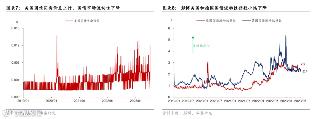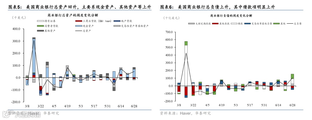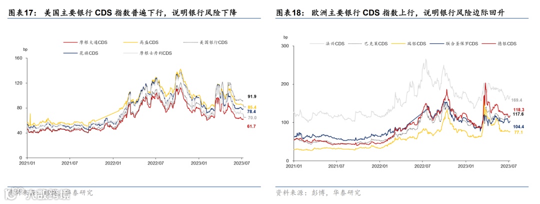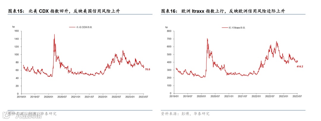 从海外金融条件来看,上周美国国债流动性下降,市场波动率小幅上行。美国6月非农数据不及预期,与ADP就业数据显著背离,导致债券市场和股票市场波动率明显上行,美国主权信用风险小幅回升;近期欧央行表态鹰派以及欧元区PMI等经济数据表现不及预期,欧洲信用风险和银行风险边际回升。