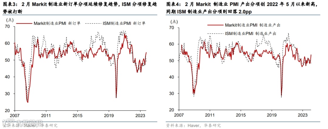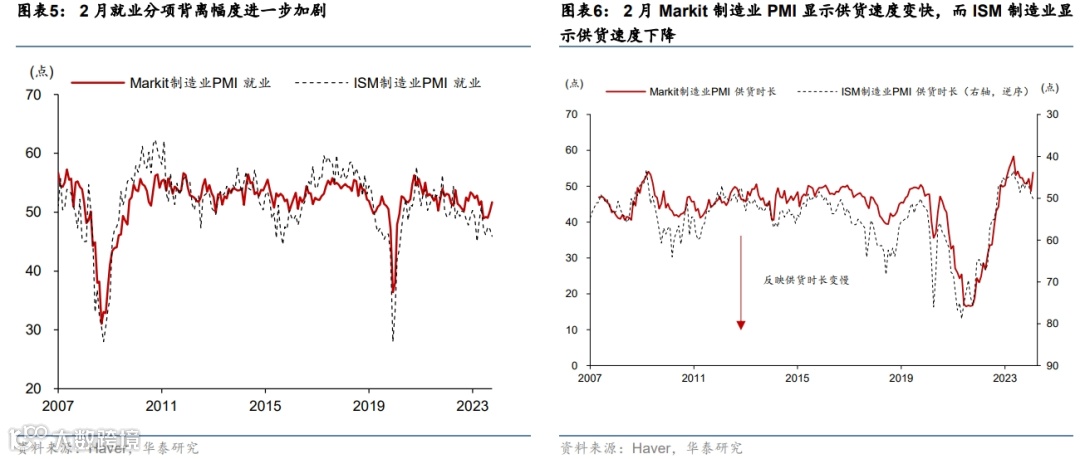 ISM和Markit制造业PMI在过去半年多的趋势里存在背离,2月背离进一步加剧。2023年以来,ISM制造业PMI持续弱于Markit制造业:前者相对2023年6月的低点回升1.4pp,回升趋势不明显,但后者相对低点回升5.9pp,达到2022年7月的最高水平;2月两者的差异进一步拉大到-4.4pp,背离程度为有数据以来的较高水平。二者在新订单、制造业产出、就业、供货时长以及产成品库存方面也存在明显差异。