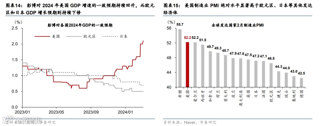 2023年以来,美国经济韧性超预期,而美国以外制造业相对更弱,这导致ISM PMI相对于Markit PMI更弱。2023年以来,由于美国财政扩张超预期,部分对冲了加息对美国经济的冲击(参见《美国为何迟迟不衰退?》,2023/7/31),这导致美国经济韧性表现要好于欧元区和其他国家。例如,2023年美国实际GDP同比增长2.5%,而欧元区仅为0.5%;2023年以来,彭博对2024年美国GDP增速的一致预期持续回升,而欧元区和日本GDP增长预期则持续下修(图表14)。此外,从Markit PMI的绝对水平来看,美国制造业PMI绝对水平显著高于欧元区、日本等其他发达经济体(图表15)。