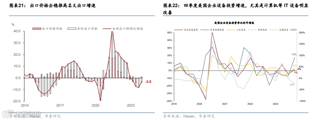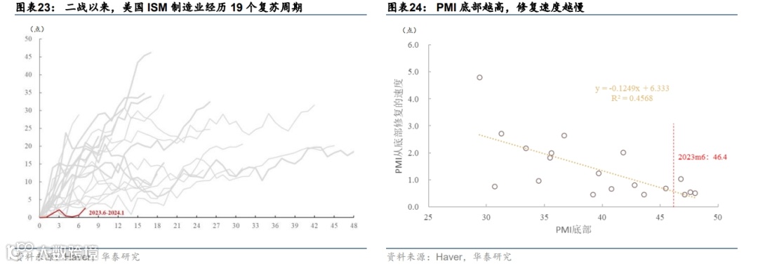 从基本面来看,ISM仍有回升空间,预计ISM和Markit制造业PMI的背离将收窄。ISM新订单/库存领先ISM制造业分项2个月,指示ISM制造业PMI未来仍有回升空间(图表18)。此外,正如我们在《如何看全球制造业PMI重回荣枯平衡线》(2024/2/29)中所论述,全球制造业周期或将结束长达2年的下行周期,在以下四点因素的支撑下,ISM预计将逐步改善,从而收窄与Markit制造业PMI的差距:2023年下半年以来海外主要央行普遍放缓或停止降息,各国长端利率见顶回落(图表19);全球制造业去库存有所放缓,全球制造业PMI产成品和原材料库存分项高位回落(图表20);出口价格企稳推高名义出口增速(图表21);美国制造业企业资本开支上行(图表22)。但是,ISM和Markit回升空间受到实际利率、绝对库存水平仍然偏高,以及本轮制造业周期的底部相对较高所制约,整体改善幅度或有限。参考二战后美国经验,PMI底部越高,PMI修复越慢(图表23和24)。