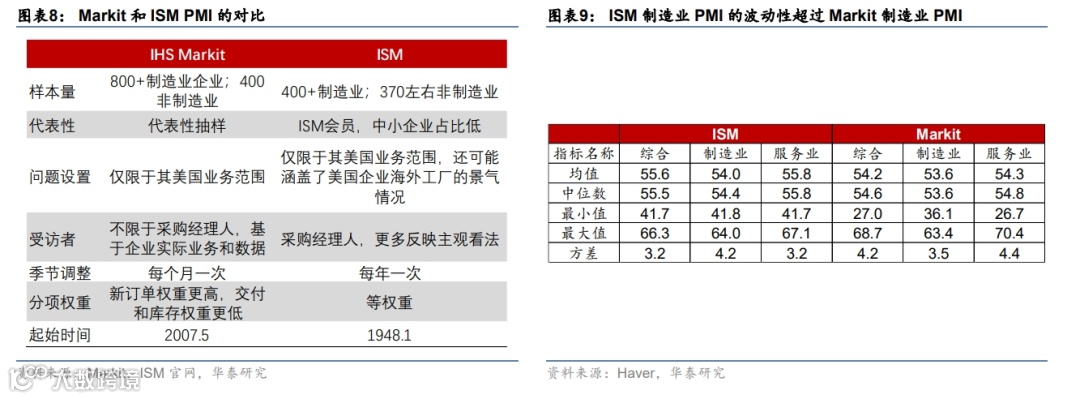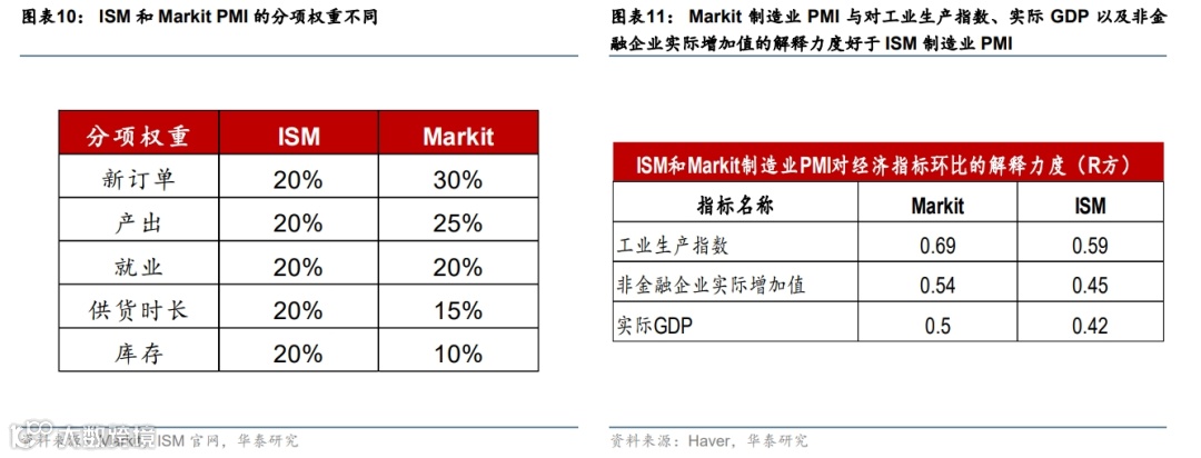 Markit制造业PMI样本量更大、代表性更强。前者800家以上的企业,采用的是代表性抽样等方法,而ISM样本量只有400家,且因为局限于ISM会员,大企业占比或更高(图表8)。这导致ISM制造业PMI的方差要高于Markit制造业PMI(图表9)。此外,ISM制造业PMI的5个分项为等权重,而Markit制造业PMI中新订单权重更高,交付和库存权重更低(图表10)。