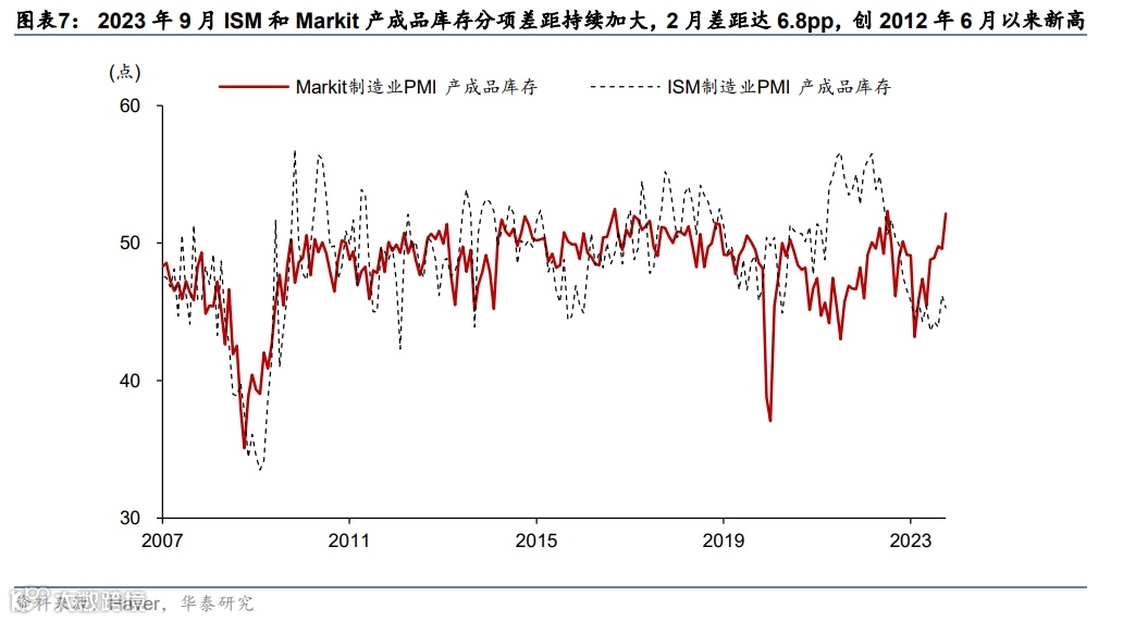 ISM和Markit制造业PMI的分项也有明显差异。从新订单分项来看,自2021年中全球制造业周期见顶以来,Markit和ISM制造业PMI的新订单趋势整体一致,但2月Markit制造业的新订单延续了2023年中以来的修复动能,相比2022年12月的底部累计反弹11.8pp,但ISM制造业PMI新订单修复趋势被打断,2月仅从低点反弹6.4pp(图表3)。从制造业产出分项来看,2月Markit 制造业PMI产出分项大幅回升4.2pp,创2022年5月以来新高,而同期ISM制造业产出分项则回落2.0pp(图表4)。从就业分项来看,2023年11月以来Markit和ISM制造业就业分项已存在一定背离,2月背离幅度进一步加剧(图表5)。从供货时长来看,二者的主要差异在于规则的统计,Markit制造业是供货速度越快则PMI分项越高,ISM制造业则反之。从趋势来看,此前二者差异不大,但2月Markit制造业PMI显示供货速度变快,而ISM制造业显示供货速度下降(图表6)。从产成品库存来看,二者在2023年9月以来差距持续加大:Markit制造业产成品库存分项明显回升,而ISM制造业产成品库存修复幅度偏弱,2月差距达6.8pp,创2012年6月以来新高(图表7)。