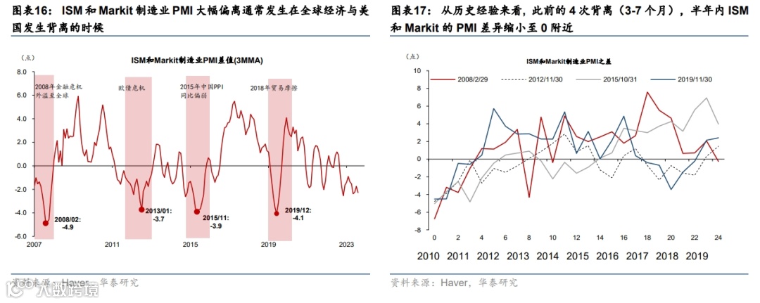 从历史经验来看,ISM和Markit制造业PMI背离达到极值水平后,半年内两者差异会缩减至0附近。