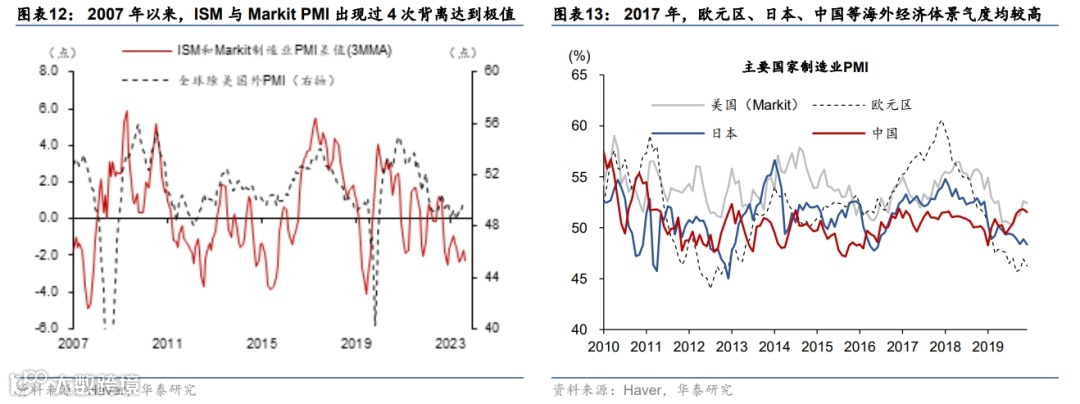 历史上,ISM 制造业PMI与Markit制造业PMI多次背离,通常发生在全球经济与美国发生背离的时候(图表12)。例如2017年ISM制造业PMI大幅超过Markit PMI,两者差异在2017年9月达到6.9的历史极值水平,这可能是因为2017年全球经济同步复苏,欧元区、中国经济景气度较高(图表13),由于ISM制造业PMI更可能受到海外的影响,导致ISM表现好于Markit。而2018年随着中美贸易摩擦加剧,美国以外的制造业整体回落,这导致ISM与Markit之间差值逐步缩表,并最终在2019年转为明显负值(图表12)。