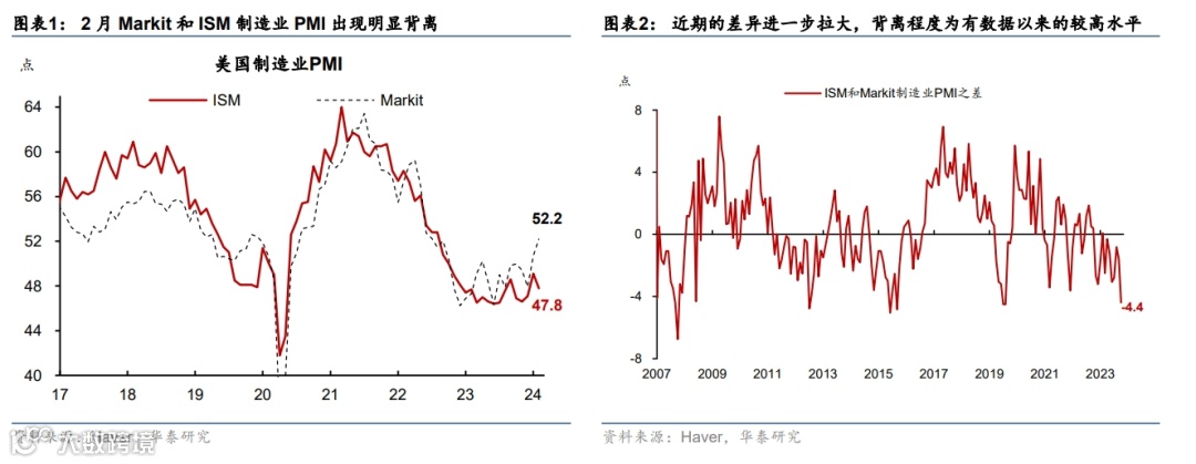 ISM和Markit制造业PMI在2月出现明显背离。2月美国ISM制造业PMI意外回落,下降1.7pct至47.8,大幅低于预期(49.5)。而此前公布的2月Markit制造业PMI回升1.5至52.2(图表1)。事实上,2023年以来,ISM制造业PMI持续弱于Markit制造业,近期的差异进一步拉大,背离程度为有数据以来的较高水平(图表2)。除了绝对水平外,ISM和Markit制造业PMI过去半年多的趋势也存在背离。Markit制造业PMI相对2023年6月的低点回升5.9pp,达到2022年7月的最高水平,而ISM制造业PMI仅相对低点回升1.4pp,回升趋势不明显。