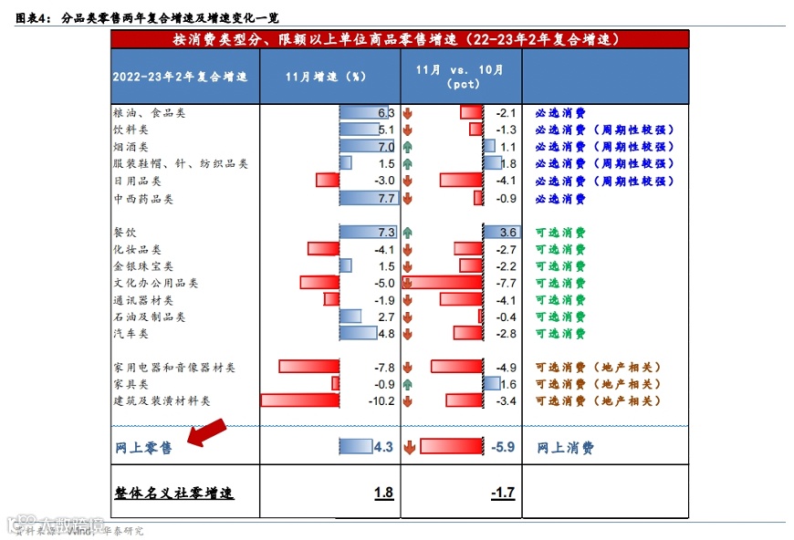 11月社会消费品零售总额名义同比增速从10月的7.6%上行至10.1%,同比回升主要受低基数支撑、低于彭博一致预期的12.5%,季调环比亦转负至-0.1%。其中,服装同比增速回升14.5个百分点至22%,或继续受换季需求提振。社零两年复合增速录得1.8%,较10月的3.5%有所回落。其中,餐饮22-23年复合增速较10月回升3.6个百分点至7.3%,服装、烟酒、家具类2年复合增速亦有上行。但化妆品、文化办公用品、通讯器材、家电等可选消费2年复合增速有所回落(图表3-4)。此外,全国服务业生产指数同比增长9.3%,比上月加快1.6个百分点。