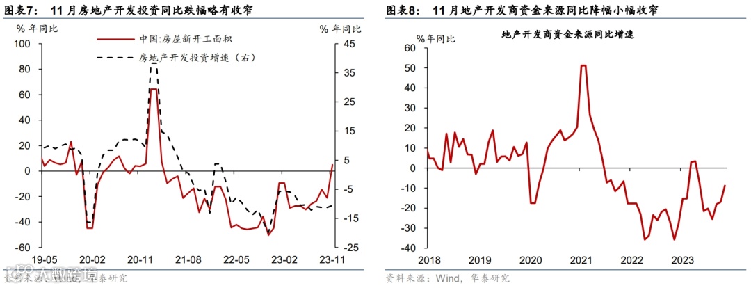 3) 房地产开发投资同比降幅略有收窄:11月房地产开发投资同比降幅较10月的11.3%小幅收窄至10.6%。新开工及施工面积同比回正,主要是基数效应影响,从2年复合增速来看,新开工22-23年降幅从10月的28.7%略收窄至27.8%,而施工面积降幅从28.7%走阔至29%,竣工面积增速较10月的1.6%回落至-5.6%,显示天气转冷或对施工带来干扰。此外,房企资金来源或仍待修复、特别是个人按揭贷款仍较弱——从2年复合增速来看,房地产销售金额较10月的-16.4%走阔至-21.1%,而销售面积较10月的-17.4%回落至-22.5%。房地产新开工面积2年复合降幅较10月的28.7%小幅收窄至27.8%,但房地产竣工面积2年复合增速从10月的1.6%回落至-5.6%。开发商现金流状况仍待改善,资金来源2年复合降幅从10月的21.9%小幅走阔至23.4%,其中国内贷款降幅收窄,而个人按揭贷款、定金及预收款2年复合降幅有所回落。