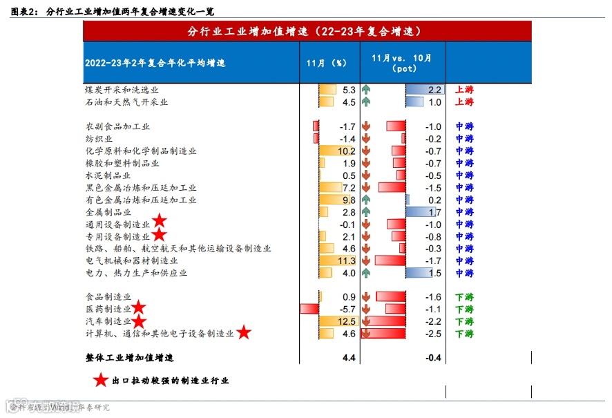 11月工业增加值同比增速较10月的4.6%上行至6.6%,高于彭博一致预期(4.5%),统计局季节调整后的环比增速从0.4%加速至0.9%。而从22-23年两年复合年化平均增速来看,11月工业增加值同比录得4.4%,较10月回落约0.4个百分点。分行业而言,汽车制造2年复合增速录得12.5%、较10月回落2.2个百分点,但仍维持较高景气度;电气机械、化学原料2年复合增速亦在10%以上的较高增速区间。煤炭开采、电力热力生产、金属制品等行业两年复合增速上行超过1个百分点。而医药制造业、纺织业和农副食品的2年复合增速仍然为负。11月出口增速在低基数下从10月的-6.4%明显回升至0.5%,2年复合增速则小幅回落1个百分点,与工业增加值增速的表现相互印证(图表1和2)。