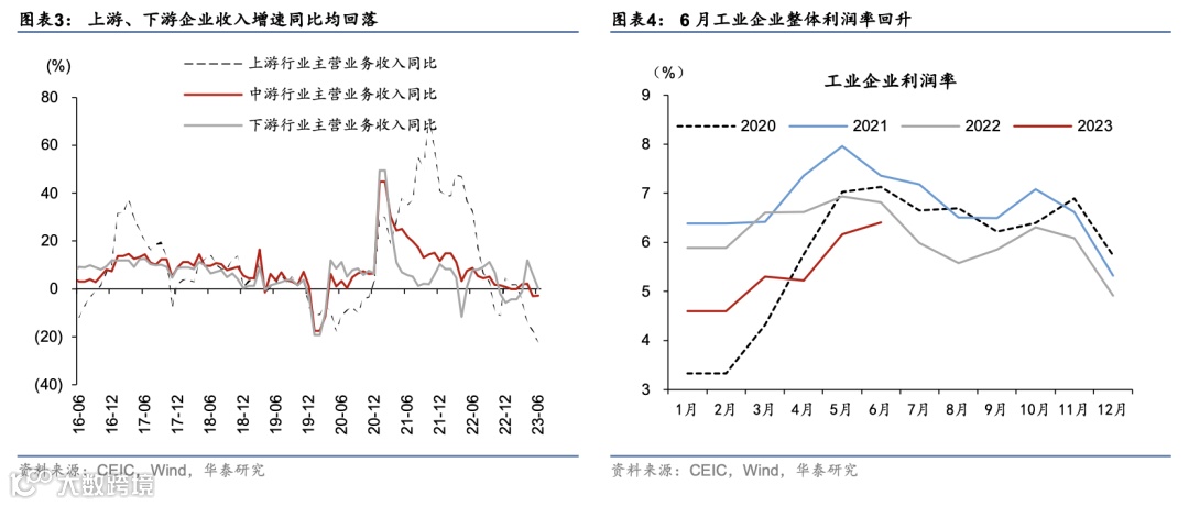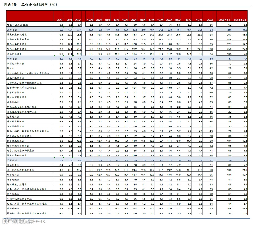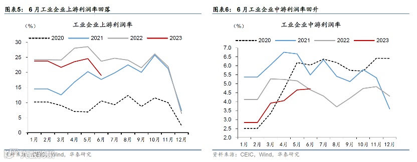6月工业企业整体利润率为6.4%,较5月再度上行0.2个百分点,但低于去年同期的6.8%。具体来看,6月上游利润率较5月24.6%下行至19%,中游行业利润率较5月的4.7%基本持平、略高于去年同期,而下游行业利润率较5月的6.8%上行至8.6%,但小幅低于去年同期的8.8%。