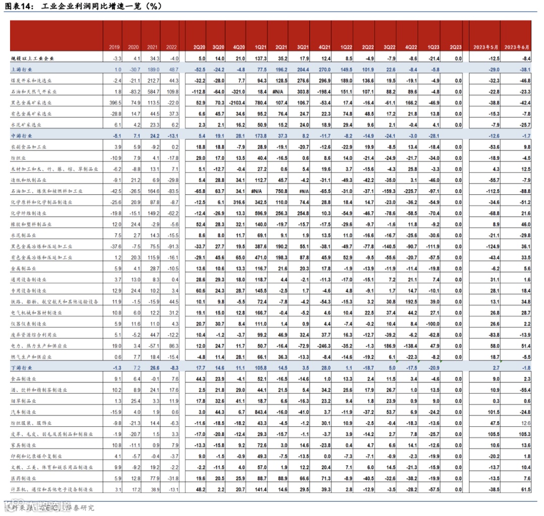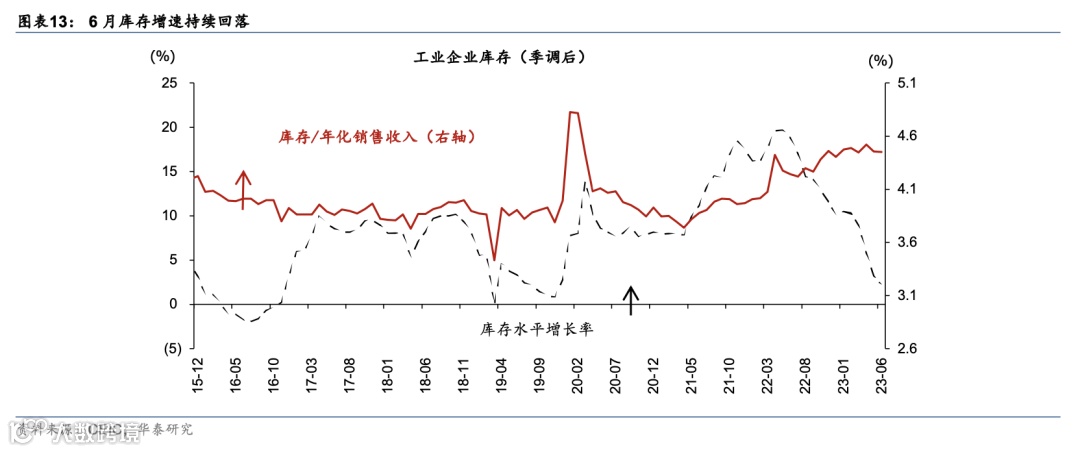 6月工业企业整体盈利延续修复态势,但可能更多来自成本端压力的短期释放及电子计算机行业的拉动,总需求的回升仍是企业利润持续改善的关键。6月企业营收从5月的-1.5%回落至-2.6%,去除基数影响,2年复合增速则显示6月较5月的2.6%上行至3.1%、但不及1季度的2年复合增速5.9%。同时,库销比高于往年同期,或体现为需求回升仍待修复、去库进程趋缓。往前看,企业盈利能力修复的持续性仍待观察,稳增长政策对稳地产、扩内需的支持效果或为关键变量,如我们在《基调积极、重在执行》(2023/7/27)中强调,月度财政广义赤字的变化及信贷周期走势仍是判断政策实际力度和效果的最有效的领先指标。