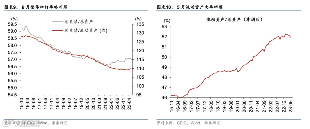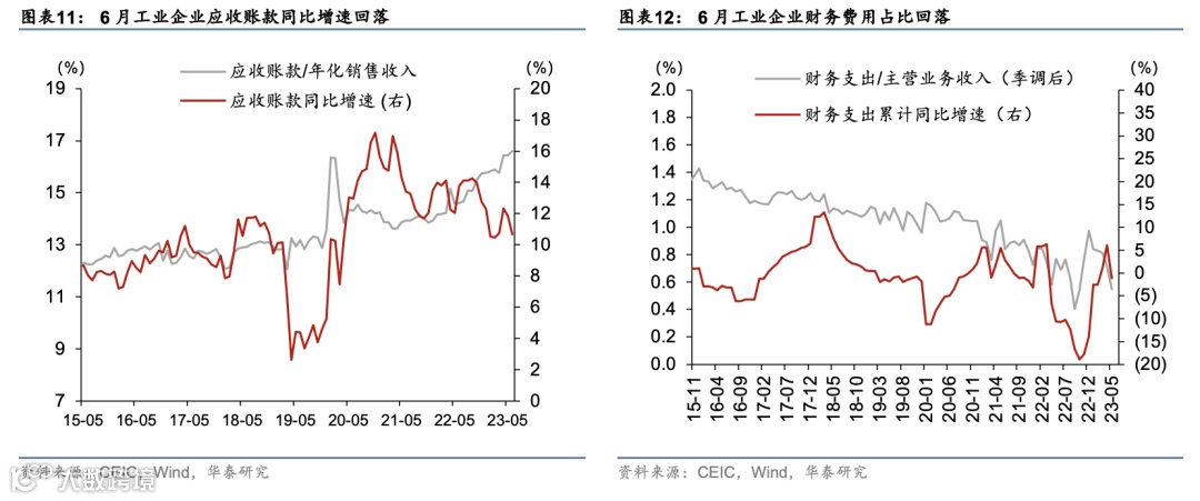 6月产成品库存增速从5月的 3.2%继续回落至2.2%,杠杆率略回落,应收账款周转增速较5月有所放缓,或显示企业去库存阶段仍在持续但速度趋缓。6月工业企业总体资产负债率较5月略回落,应收账款(与销售收入)比率略上行(图表9,11及13)。