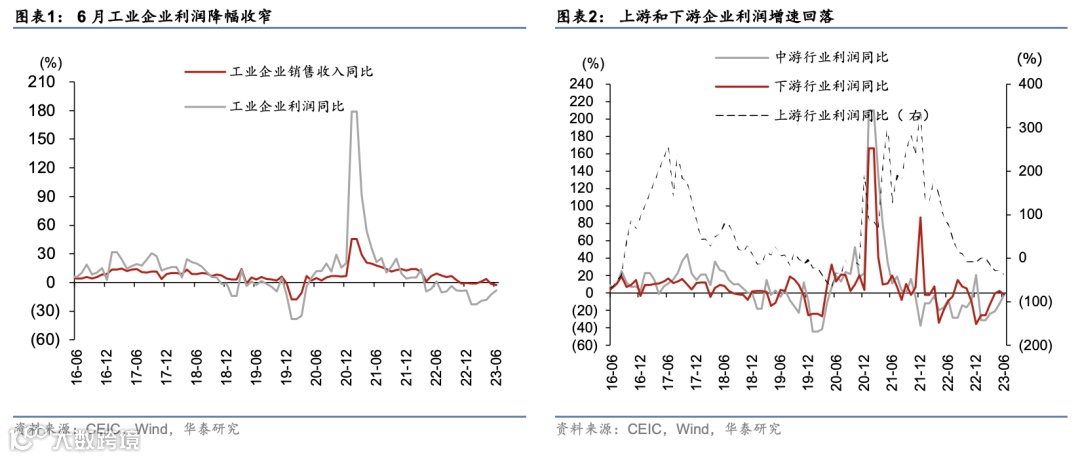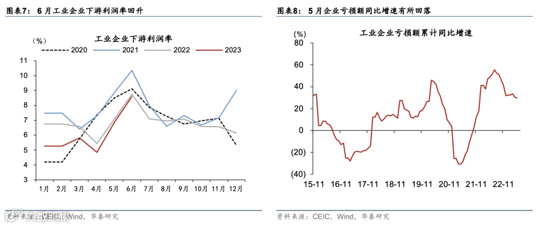 汽车同比增速从5月101.5%回落至-24.8%,对利润同比的拖累约为1.8个百分点,主要受基数扰动,两年复合增速从5月的1.7%平稳回升至3%。此外,木材加工、家具、纺织服装、娱乐用品等行业利润的2年复合增速回升、但酒精饮料、食品制造等2年复合增速回落。