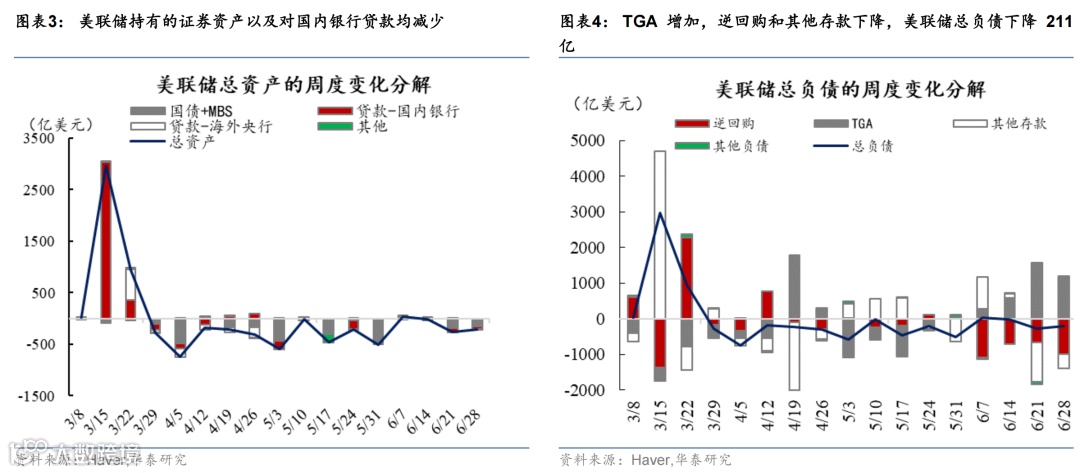 6月21日-6月28日美联储总资产下降211亿美元,主要来自持有的证券资产和对国内银行贷款的下降。硅谷银行事件以来,美联储对银行系统贷款增加2668亿,但由于证券资产下降2628亿和其他资产下降54亿,联储总资产首次低于硅谷银行风波前,累计下降14亿美元。最新一周,美联储缩表,欧央行小幅扩表;G3央行总资产规模下降567亿美元。本周观察:1)BTFP贷款连续第八周上升,规模达到1031亿美元,但其他(过桥)贷款规模下降,贴现窗口规模基本不变;2)TGA存款继续大幅增加,逆回购连续四周大幅下降,其他存款继续回落;3)净流动性连续两周回落。