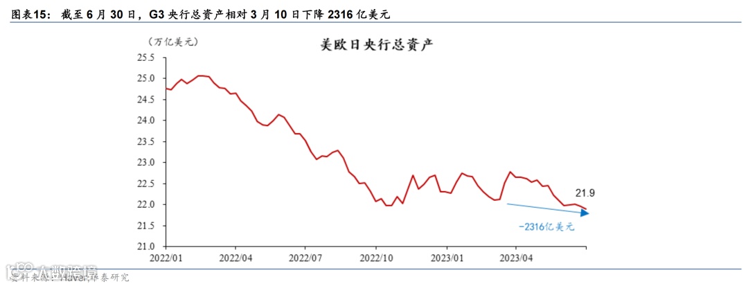 3月8日硅谷银行破产之后,联储曾连续两周扩表3915亿美元,此后总资产总体回落。本周联储缩表211亿美元,资产规模首次低于硅谷银行风波前、较3月8日累计下降14亿。6月28日联储公布银行年度压力测试结果,所有23家美国大银行均通过压力测试,即使严重衰退情形下,银行普通股权一级资本比率(CET1)仍高于监管要求,显示美国大银行韧性较强;截至本周四美国区域银行指数相对上周五反弹4.3%,相对3月8日累计下跌28.4%。1季度美国GDP环比折年增速由1.3%超预期上修至2%,叠加鲍威尔重申鹰派立场,市场加息预期上调,高利率下美国银行系统脆弱性乃至全球金融系统的稳定值得持续观察。G3央行储资产负债表的变化可能是最早发现金融体系流动性和压力值变化、及海外主要央行政策取向的前瞻性指标。