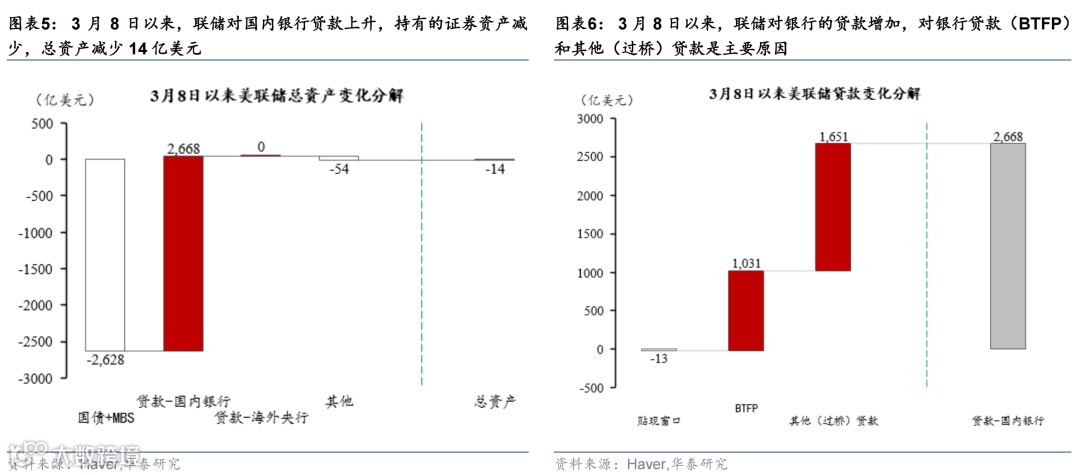 1. 资产端,总资产减少211亿(前一周-263亿)。其中,国债和MBS减少158亿(前一周-194亿)。对国内银行贷款总体下降39亿,其中BTFP(1年内)增加3亿(前一周+8亿),但其他(对FDIC过桥)贷款规模的减少82亿,贴现窗口贷款基本不变。