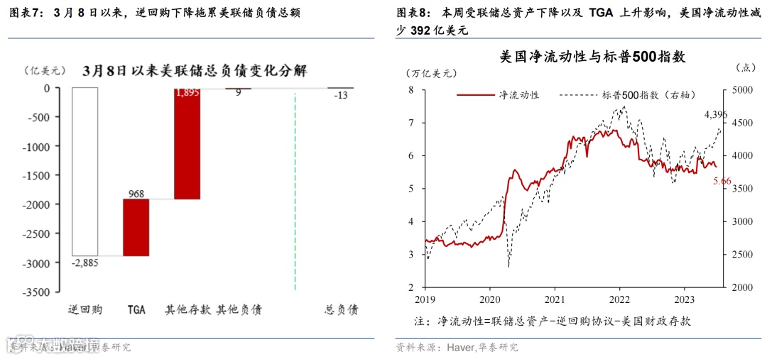 3. 净流动性指标下降(净流动性=总资产-财政存款-逆回购,代表流入金融体系的资金),TGA大幅增加,流入金融体系资金下降,导致净流动性连续两周下降,本周减少392亿(前一周-1167亿,2022年周平均-200亿)。