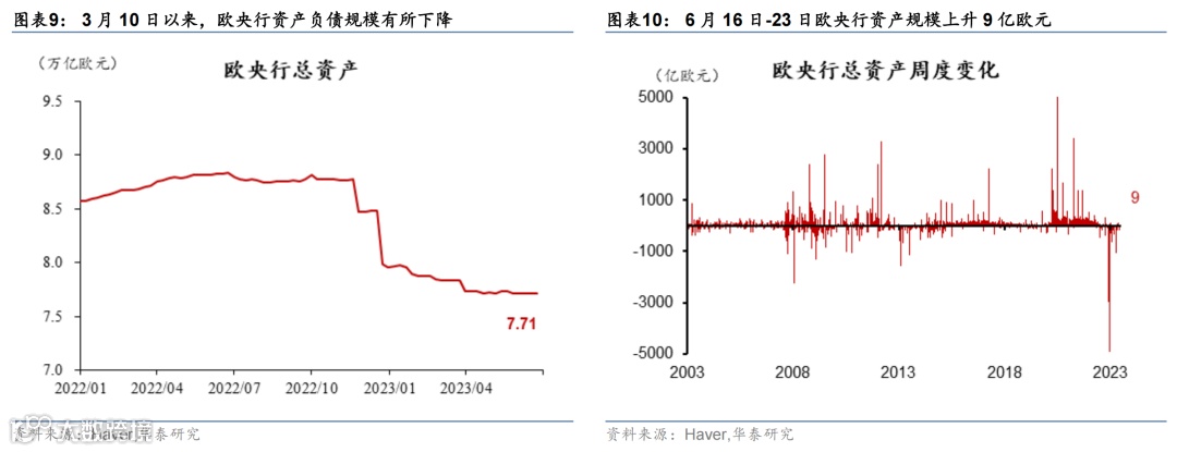 欧央行(6月16日-23日)总资产上升9亿欧元(上周-47亿欧元)。硅谷银行以及瑞信事件以来,欧洲银行体系整体较为平稳。