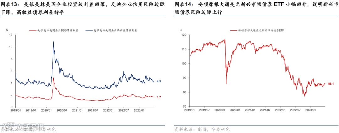海外信用风险:1)企业信用利差,美银美林美国企业投资级(BBB)债和高收益债券利差水平越高,企业融资成本和难度越大,而安硕摩根大通美元新兴市场债券ETF表示以美元计价的新兴市场债券价格,价格越低表示新兴市场债券收益率越高,新兴市场企业融资成本和难度越大。2)信用违约掉期,北美CDX指数(投资级企业)、欧洲Itraxx指数(投资级企业)和主要银行的CDS指数越高,代表债券违约风险越大。