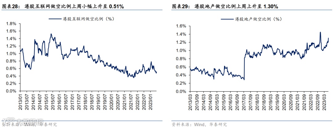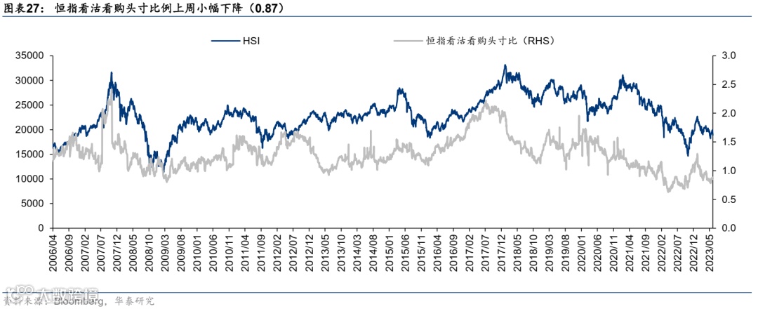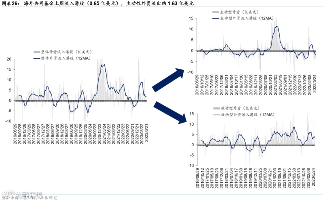 资金流动和头寸:1)南向资金,刻画内资对港股的配置行为和当期行业偏好。2)外资动向,利用EPFR提供的海外共同基金资金流数据,监测外资主动、被动型共同基金的交易行为与偏好。3)空头头寸,利用恒生指数看沽看购头寸比刻画空头头寸,自下而上计算了港股互联网、地产两大重点板块的做空比例情况,反映空头对港股整体和主要港股板块的交易行为与偏好。4)产业资本,统计全部港股产业资本回购的家数和总金额情况,一般而言,产业资本大额回购是重要的底部行为信号。