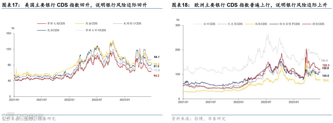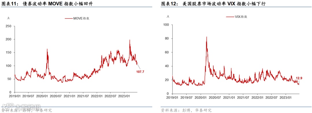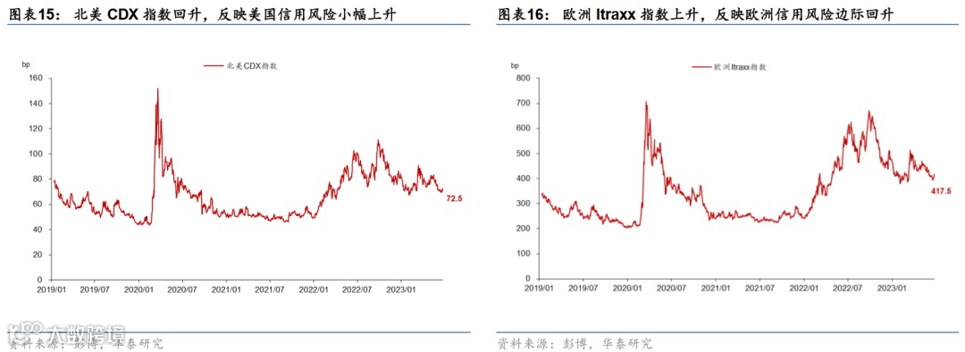 从海外金融条件来看,上周美欧风险和银行的信用风险小幅回升。上周鲍威尔在国会听证会上表现鹰派、英国和挪威央行均超预期加息,导致市场担忧海外利率将维持“higher for longer”,债券市场波动率小幅回升,美国的企业信用风险,以及美欧主要银行的信用风险也边际回升。
