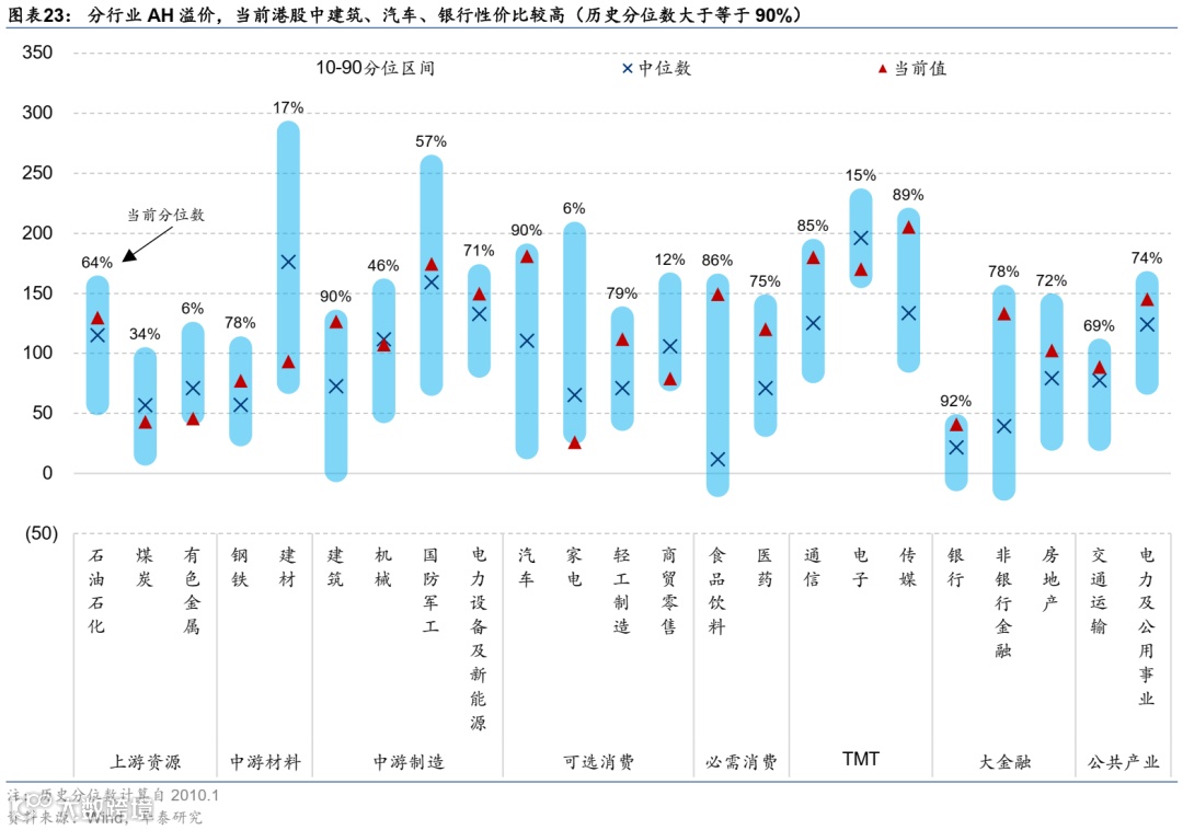 港股估值情况:1)主要指数估值历史分位数:恒生指数采用常用的PETTM与PBLF,考虑此前互联网企业盈利情况或不适用于PE估值法,恒生科技指数采用PSTTM作为替代指标。2)AH溢价情况,反映分行业港股股价当前相对A股的投资性价比。