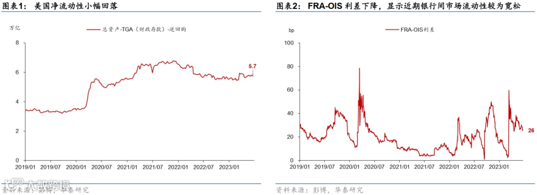 美元流动性指标:1)美元净流动性=美联储总资产-财政存款-逆回购是流入金融体系的资金量,净流动性越高,美元整体越充裕。2)银行系统压力监测指标,FRA-OIS利差是3个月期Libor和隔夜利率互换之间的差额,息差扩大反映了银行间借贷成本上升;美国银行业存款累计变动反映了SVB事件后银行存款端的流失压力;美联储BTFP贷款量反映了银行的应急流动性需求;美国商业银行资产负债表的变动展示了细分科目的周度变动情况。3)国债市场流动性,美国国债买卖价差越小代表国债市场流动性越好;彭博美国和德国国债流动性指数越小,国债市场流动性越好。4)外汇市场美元流动性:欧元、日元、英镑货币互换基差代表使用上述货币在外汇市场获得美元所需要付出的额外成本,基差越小(即绝对值越大)代表外汇市场上美元越稀缺,获得美元的成本越高;FIMA 回购协议工具与央行货币互换工具(Swap)都是海外央行从美联储获取美元流动性的工具,FIMA和Swap的使用量越大,表示海外美元需求越高,稀缺性越大。5)波动性指数,MOVE指数和VIX指数越高,分别代表美国国债市场和美国股票市场波动性越大。