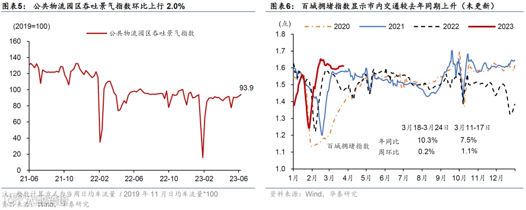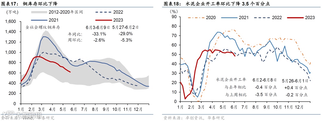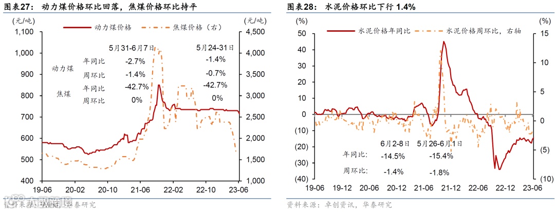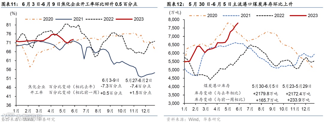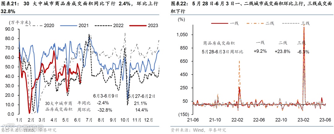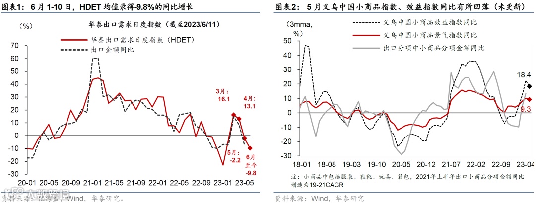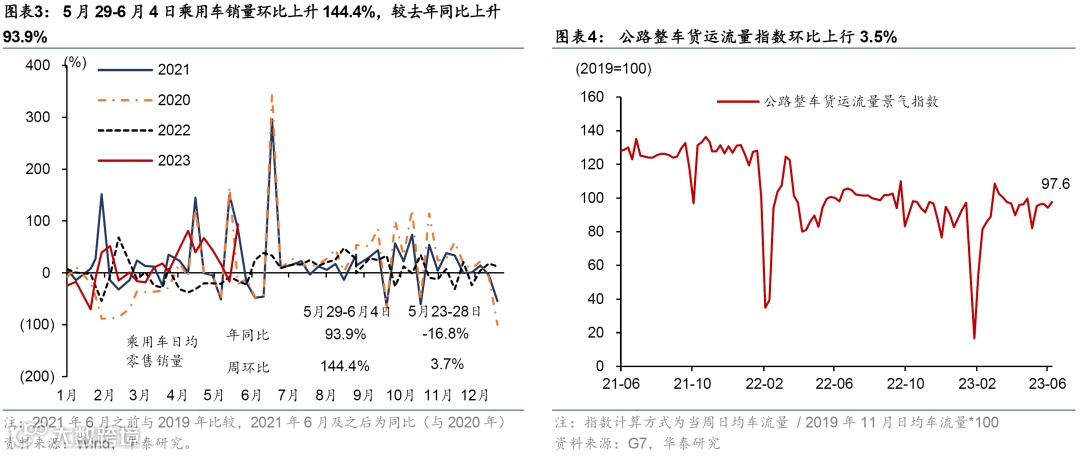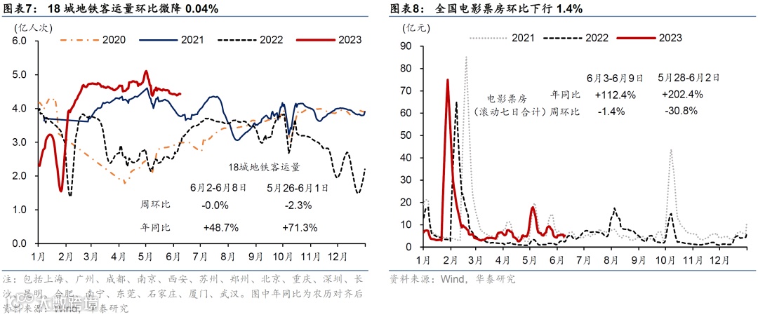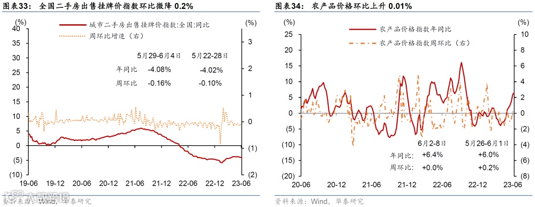 居民出行景气度指标环比持平,工业生产总体有所放缓,新房和二手房成交面积仍然弱于往年同期,土地成交环比下行。居民交通出行维持较高景气度:18城地铁客运量环比基本持平,较21/19年同期上行17.6%/12.9%;国内航班数环比微降1.8%,但国际航班数环比上升1.7%,分别为19年均值的109.4%/52.8%。消费方面,电影票房环比回落1.4%;乘用车销量环比回升144.4%、且高于21年同期超过5成,或受商务部促汽车消费政策提振。华泰出口需求日度指数(HDET)6月拟合值录得-9.8%。物流景气度指标总体上行:公路整车货运周环比上行3.5%,物流园区吞吐景气指数环比回升2.0%,分别为19年均值的97.6%/93.9%。工业生产总体有所放缓:水泥企业开工率环比回落3.5个百分点,粗钢产量环比下行3.7%;5月下旬火力发电量环比上行3.2%,且高于去年同期31.4%。地产方面,新房二手房成交仍然弱于往年同期,土地成交环比下行:上周30城商品房成交面积较21年同期下行51%;26城二手房成交面积较21年同期下行16.4%;5月29-6月4日,土地成交面积环比下行27.1%,同比低于去年同期18.5%。
