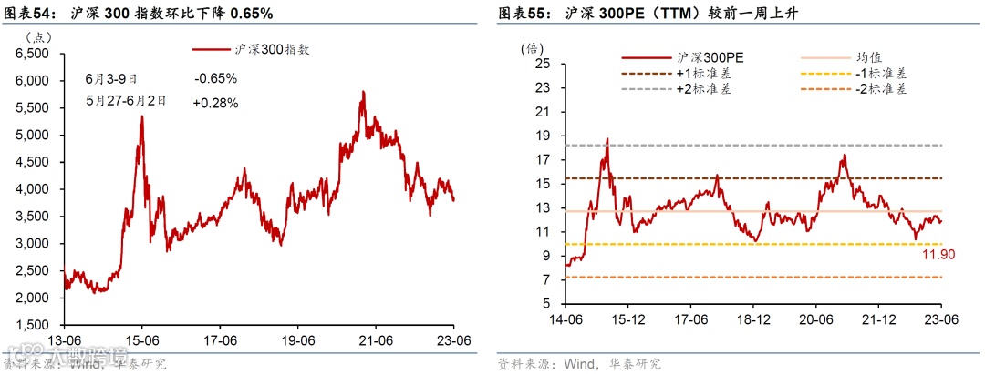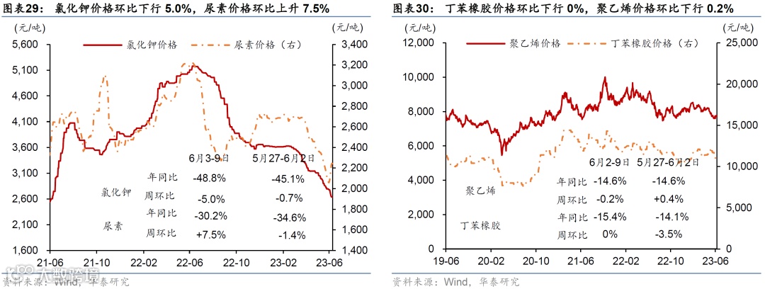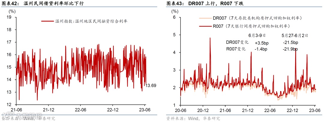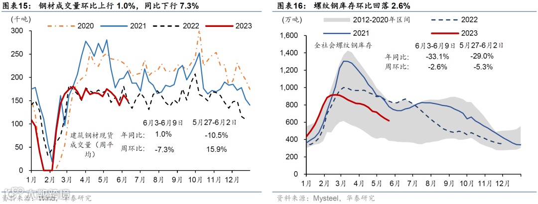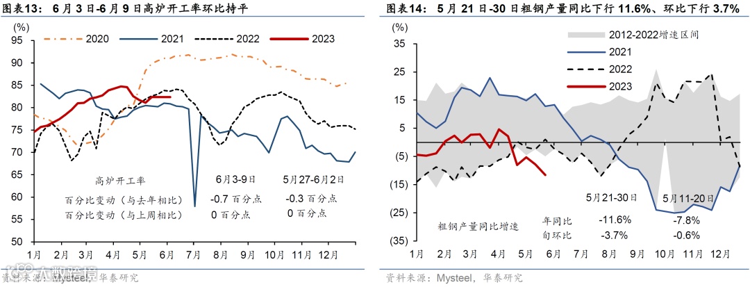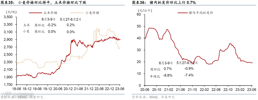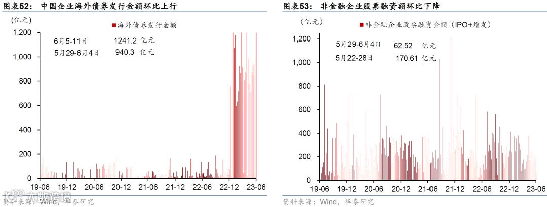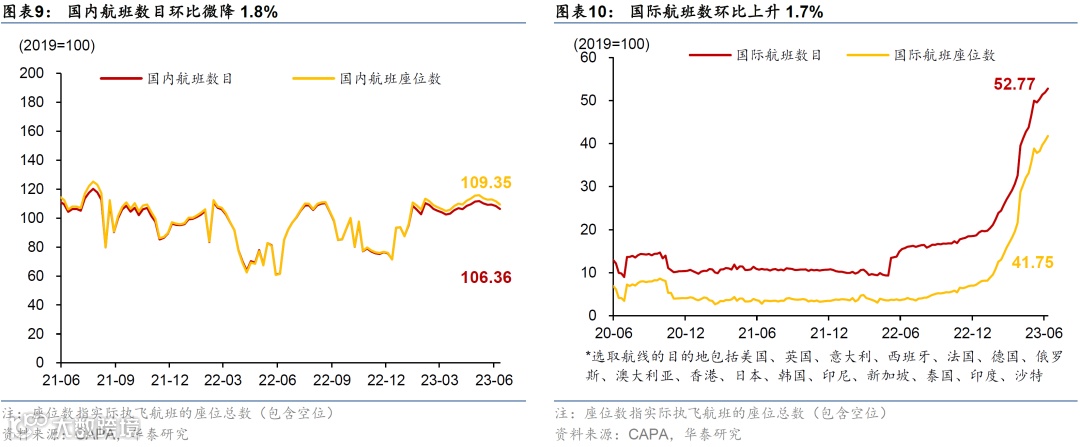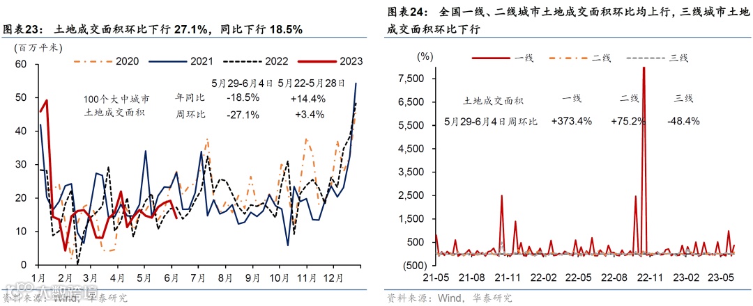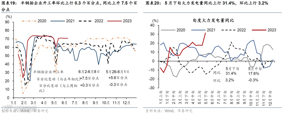 居民出行景气度指标环比持平,工业生产总体有所放缓,新房和二手房成交面积仍然弱于往年同期,土地成交环比下行。居民交通出行维持较高景气度:18城地铁客运量环比基本持平,较21/19年同期上行17.6%/12.9%;国内航班数环比微降1.8%,但国际航班数环比上升1.7%,分别为19年均值的109.4%/52.8%。消费方面,电影票房环比回落1.4%;乘用车销量环比回升144.4%、且高于21年同期超过5成,或受商务部促汽车消费政策提振。华泰出口需求日度指数(HDET)6月拟合值录得-9.8%。物流景气度指标总体上行:公路整车货运周环比上行3.5%,物流园区吞吐景气指数环比回升2.0%,分别为19年均值的97.6%/93.9%。工业生产总体有所放缓:水泥企业开工率环比回落3.5个百分点,粗钢产量环比下行3.7%;5月下旬火力发电量环比上行3.2%,且高于去年同期31.4%。地产方面,新房二手房成交仍然弱于往年同期,土地成交环比下行:上周30城商品房成交面积较21年同期下行51%;26城二手房成交面积较21年同期下行16.4%;5月29-6月4日,土地成交面积环比下行27.1%,同比低于去年同期18.5%。