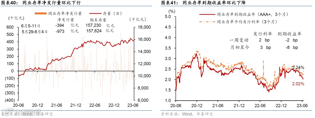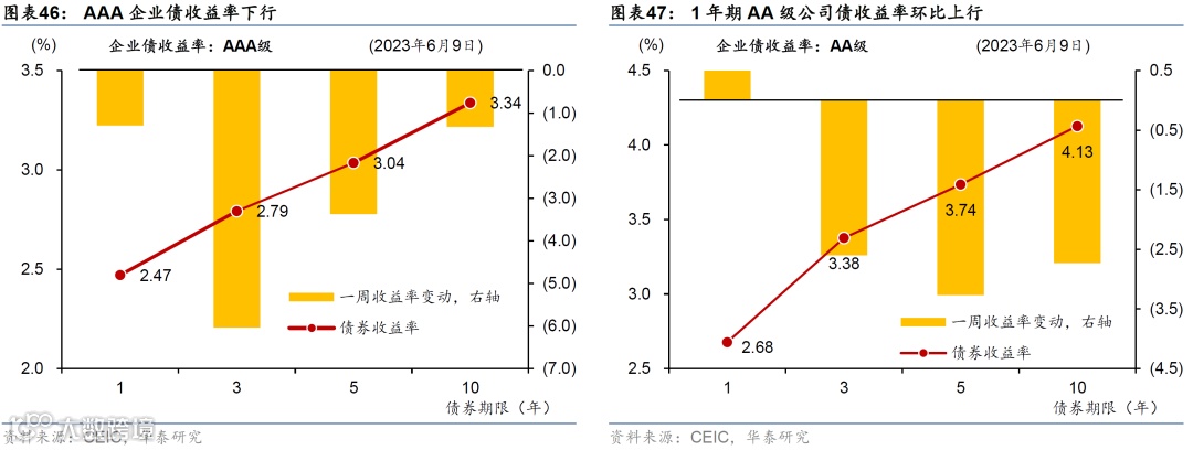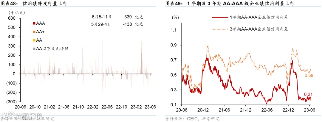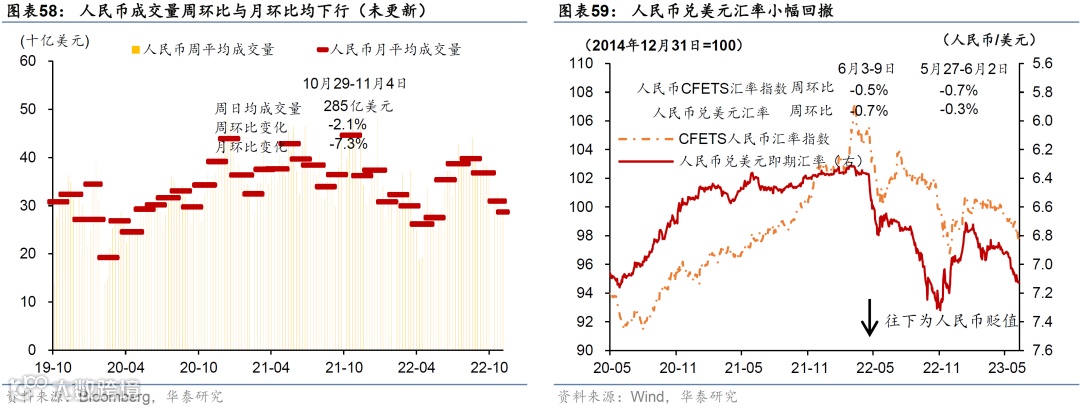 银行间流动性边际宽松,人民币兑美元汇率持续下行。上周银行间利率表现分化,R007回落1.4个基点,而DR007上行3.5个基点,二者利差小幅收窄。1/10年期国债收益率分别下行10/3个基点,国债收益率曲线小幅趋陡,企业债收益率整体下行。融资方面,上周海外债发行金额环比走高,但房地产债发行量、股权融资额均环比下行。人民币兑美元汇率环比回撤0.7%,较一篮子货币回落0.5%。