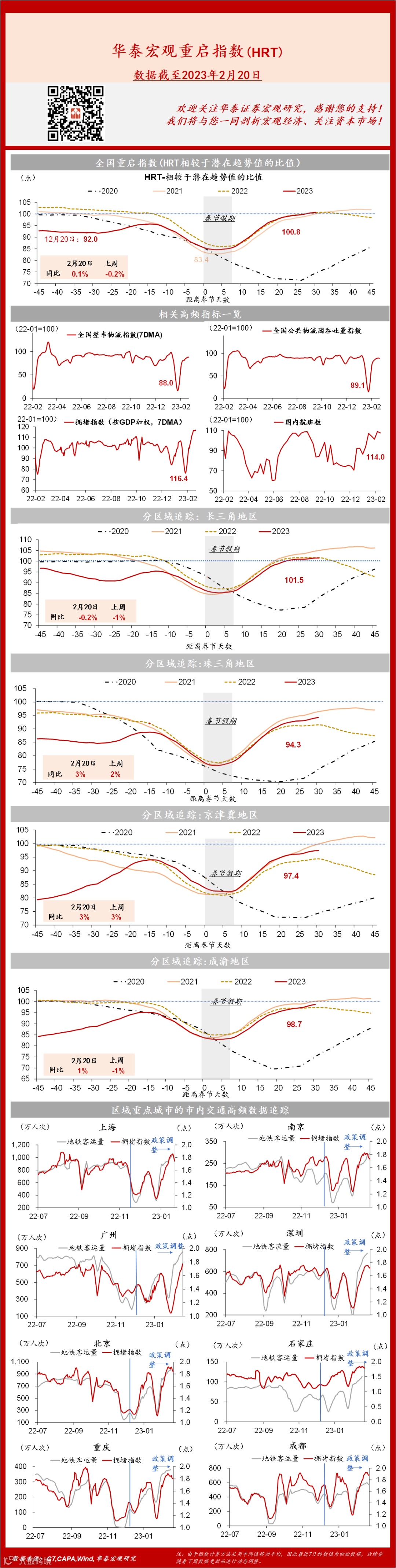截至春节后第30日,华泰宏观重启指数(HRT)较潜在趋势值的比值与去年春节同期同比回升0.1%(v.s.上周增速-0.2%),同比增速较上周上行约0.3个百分点。