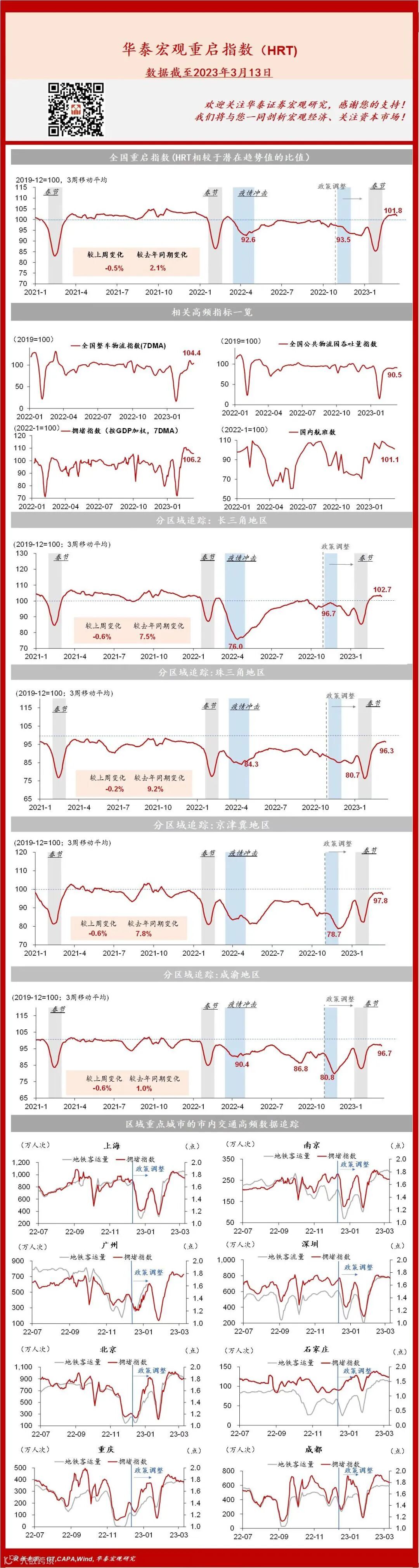 京津冀地区:从2022年底疫情政策调整至今,经济活动稳步复苏,HRT指数持续增长。截至3月13日,指数较去年同期增长7.8%,较上周环比下降0.6%,目前较趋势值的缺口约2.7%,低于2021年同期2.6个百分点。