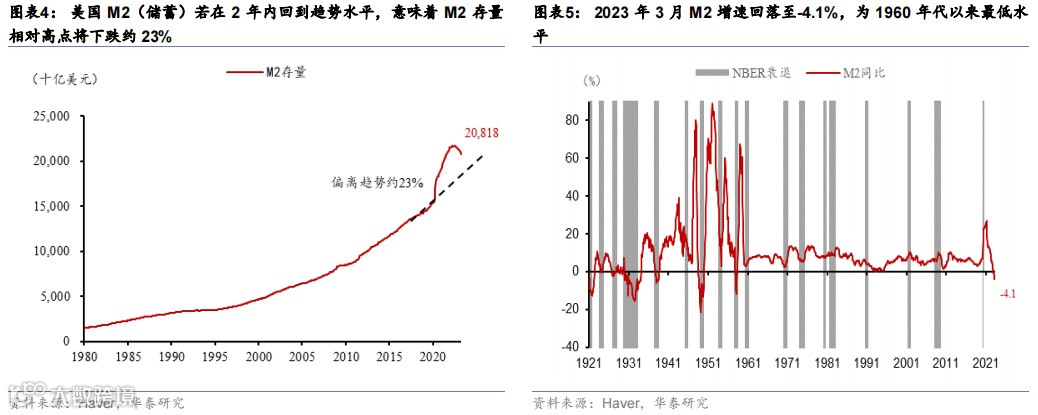联储扩张基础货币只能暂缓银行负债端存款(M2)收缩的压力,美国银行体系仍然在持续“失血”。美国M2(储蓄)在2020-22短短两年时间飙升40%或6万亿美元,高点超出之前趋势约3.8万亿,若在2年内回到趋势水平,意味着M2存量相对高点将下跌约23%(图表4)。如今,美国M2增速从2022年2月27% 的高点迅速回落至2023年3月的-4.1%,为1960年代以来最低水平,且未来仍可能继续回落(图表5)。3月8日硅谷银行破产后,联储在3月8-23日一度大幅扩表3915亿美元,此后美联储出售国债和MBS以及海外央行偿还贷款导致美联储资产负债表收缩1710亿(图表6)。但美联储的扩表仅暂时缓解了银行负债端收缩的压力,由于美联储持续缩表,以及银行存款仍显著低于货币市场基金利率,存款仍然在持续流出美国银行体系。3月8日到4月19日,美国商业银行存款累计下降4012亿美元(相对3月8日下降2.3%),中小银行存款下降2130亿美元(相对3月8日下降3.8%);4月19日-4月26日,银行通过贴现窗口和BTFP从美联储获得的流动性连续两周边际增加,也显示银行流动性压力仍然持续存在(参见《周度G3央行资产负债表追踪-联储减国债和扩BTFP同时进行》,2023/4/28)。
